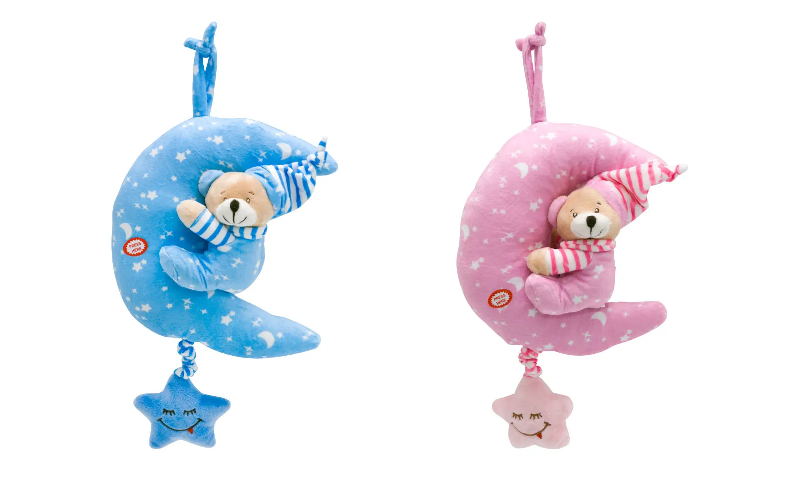 Plišani medvjedić drži mjesec sa smijućom zvijezdom u ružičastoj ili plavoj boji veličine 23 cm. Kada povučeš smijuću zvijezdu s konopcem prema dolje, oglasi se melodija.