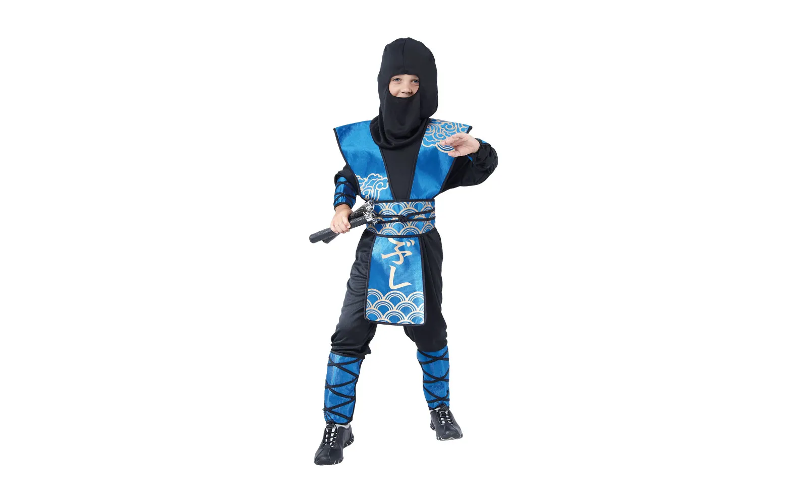 Dječji karnevalski kostim ninja u plavoj boji uključuje majicu, hlače, rukav, nogavicu, kapuljaču i oklop. Veličine S (110-120 CM), M (120-130 cm) i L (130-140 cm). Sastav: 100% POLIESTER