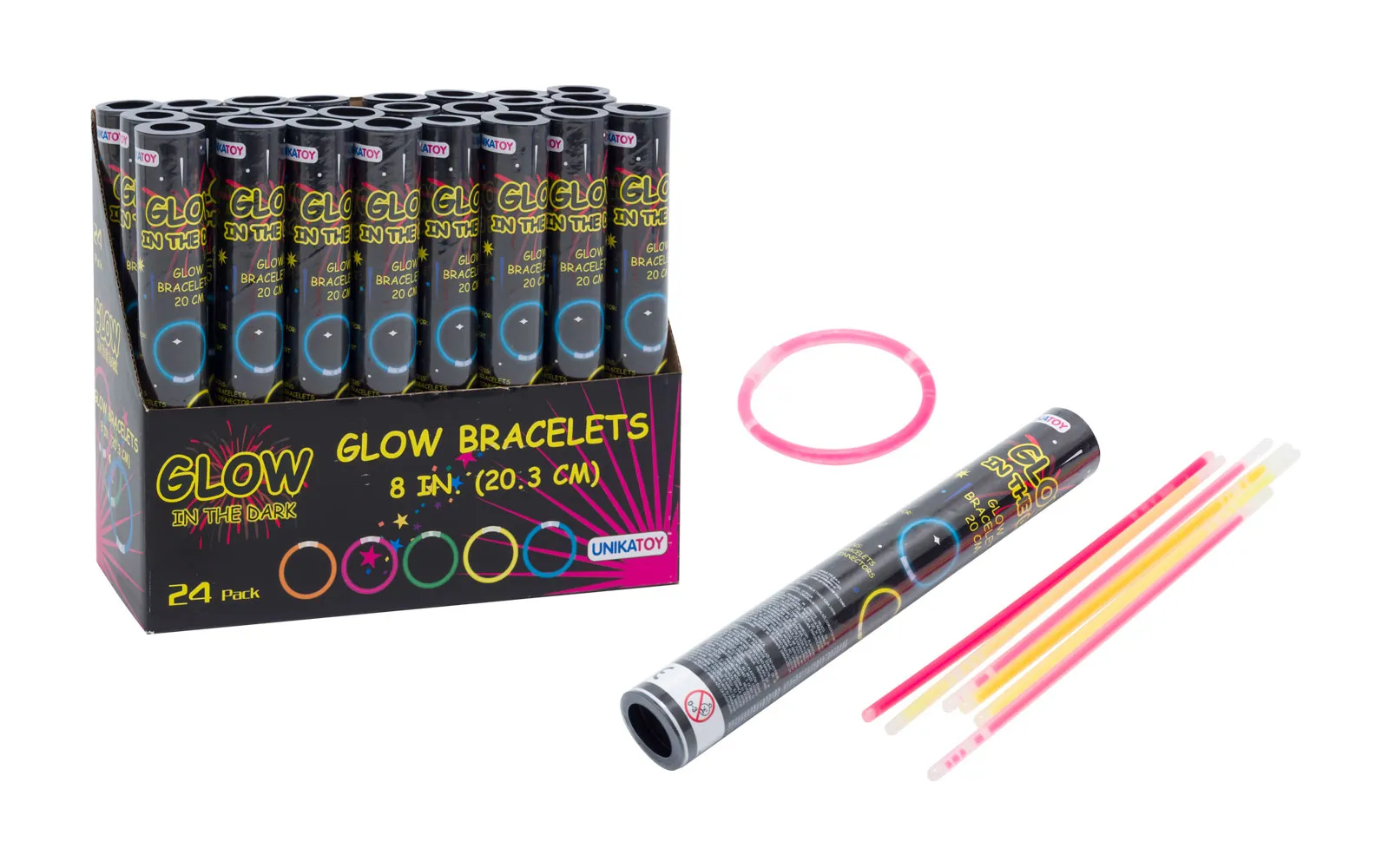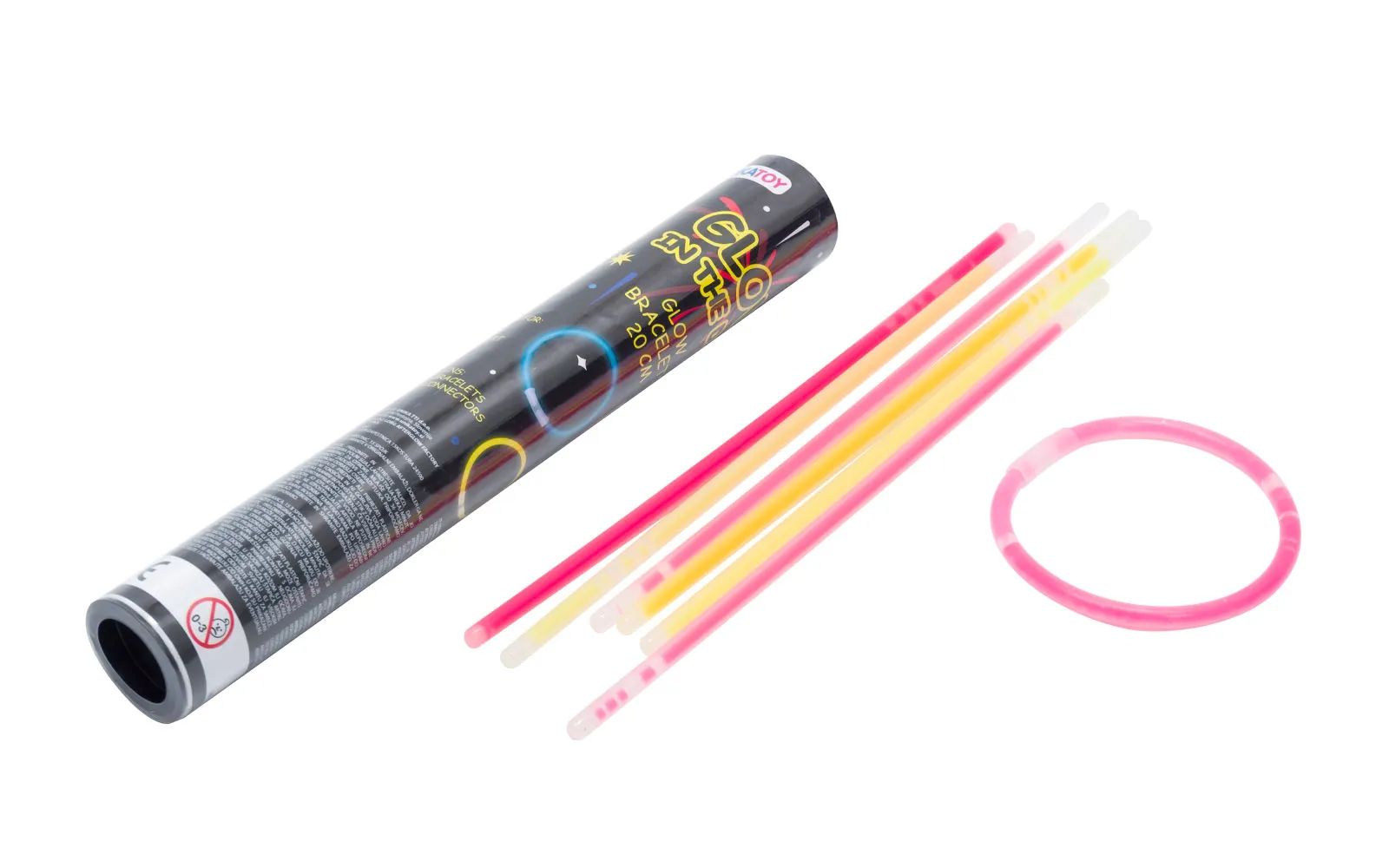 Set sadrži 15 sjajnih narukvica u žutoj, narančastoj, ružičastoj, plavoj ili zelenoj boji. Aktivirate štapić tako da ga savijete, prelomite i protresete. Da se aktivira puni sjaj, može potrajati nekoliko minuta. Kad savijete štapić, spojite ga s priloženom spojnicom i dobijete narukvicu.