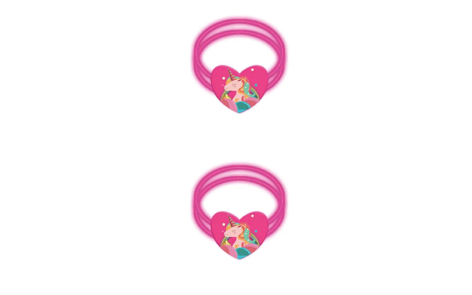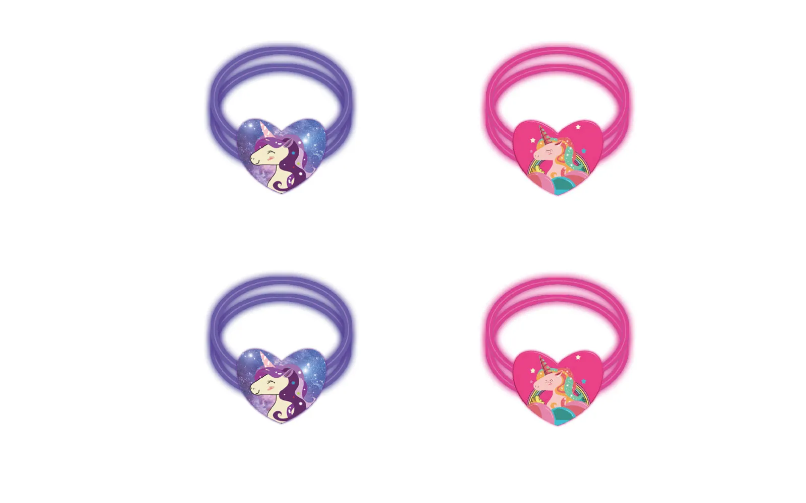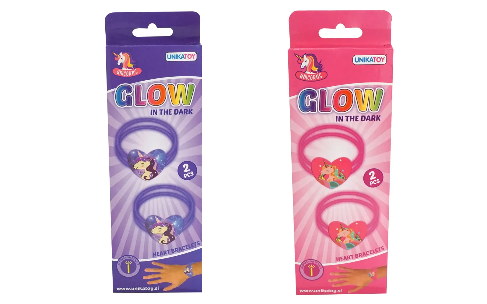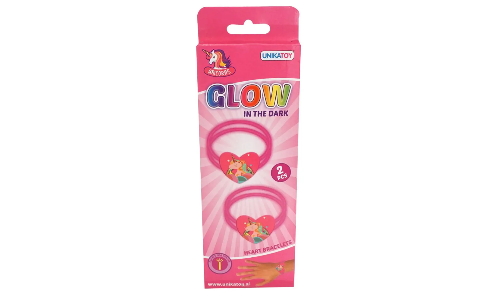 Set sadrži: 4 x svijetleća štapica, 2 x spojnica u obliku srca s motivom jednoroga roze ili ljubičaste boje. Štapicu aktivirate tako da je savijete, prelomite i protresete. Da bi se aktivirao puni sjaj, može proći nekoliko minuta. Kada savijete štapicu, spojite je s priloženom spojnicom i dobijete narukvicu.