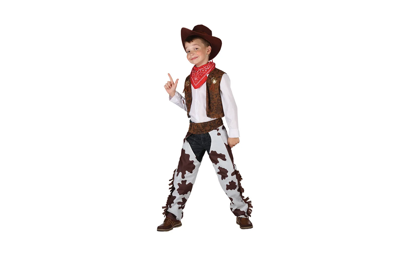 Uvijek zabavne, uvijek aktualne su igre u koje su uključeni kauboji, zato obuci dječji karnevalski kostim kauboja koji sadrži prsluk, kaubojske gaće, šešir i maramu (pistolj, košulja, hlače i cipele nisu priloženi). Veličina S (110-120 cm), M (120-130 cm) i L (130-140 cm). Sastav: 100% POLIESTER