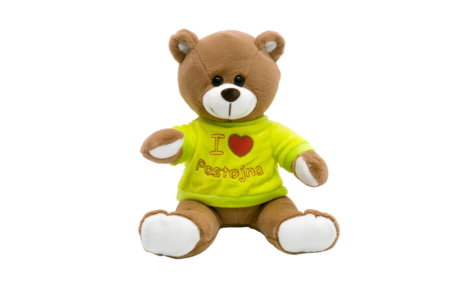 Skupljen plišani smeđi medvjedić sa zelenom majicom, na kojoj piše I love Postojna, visok je 20 cm.