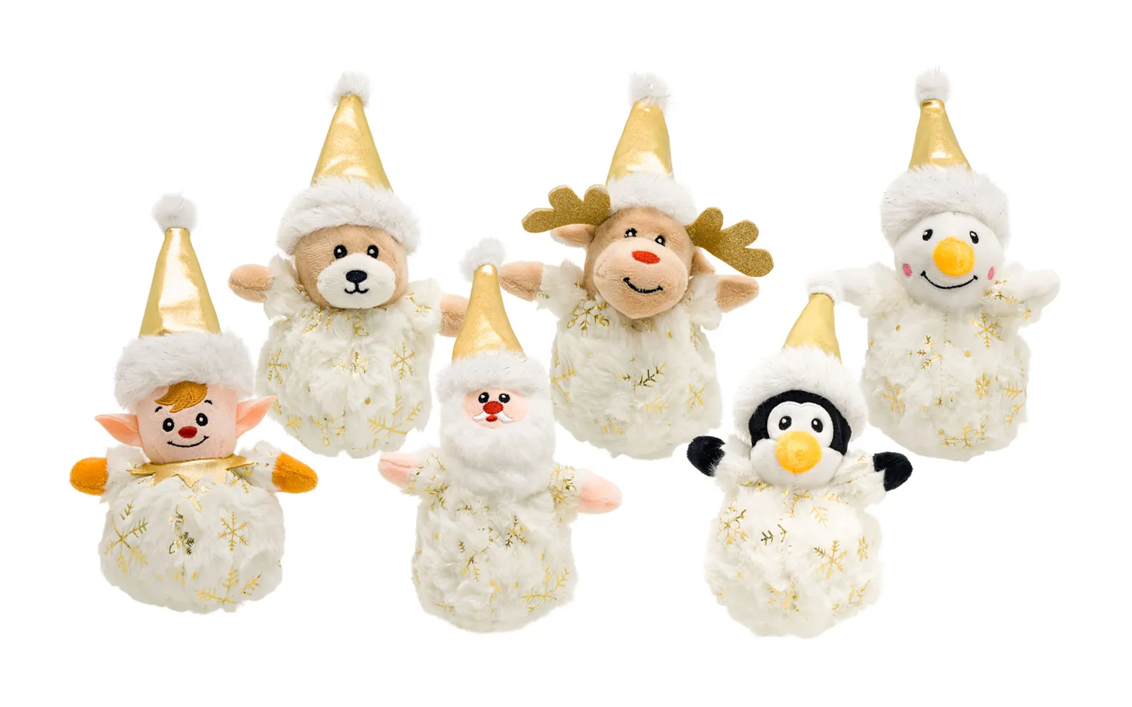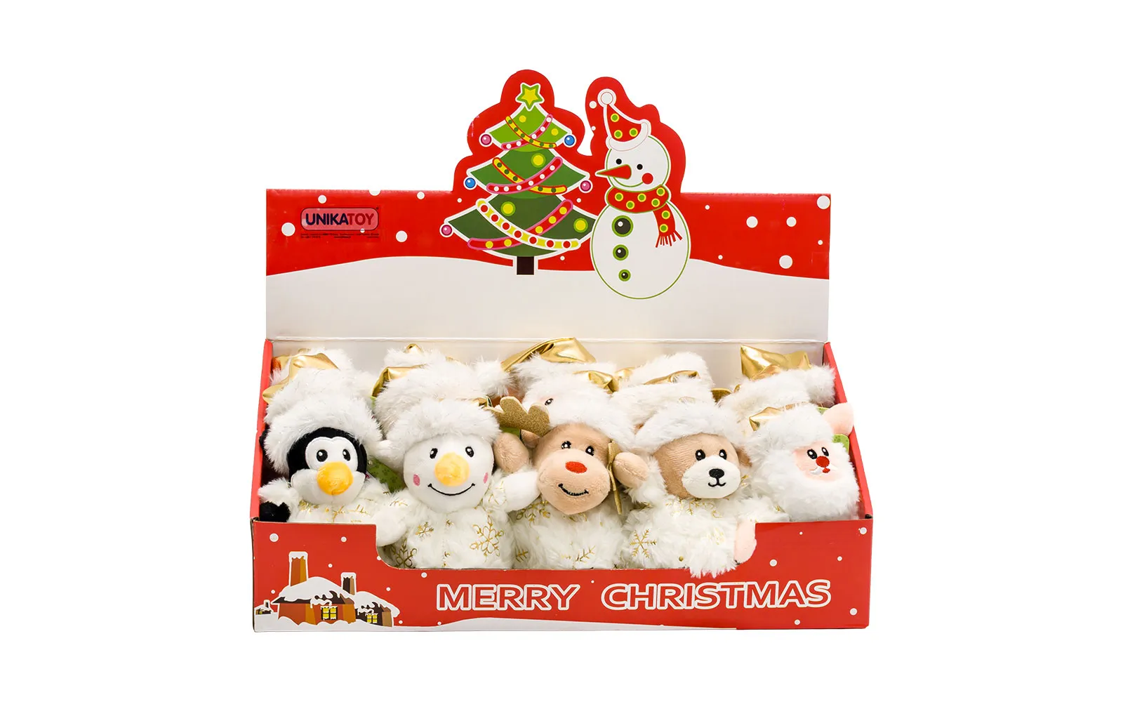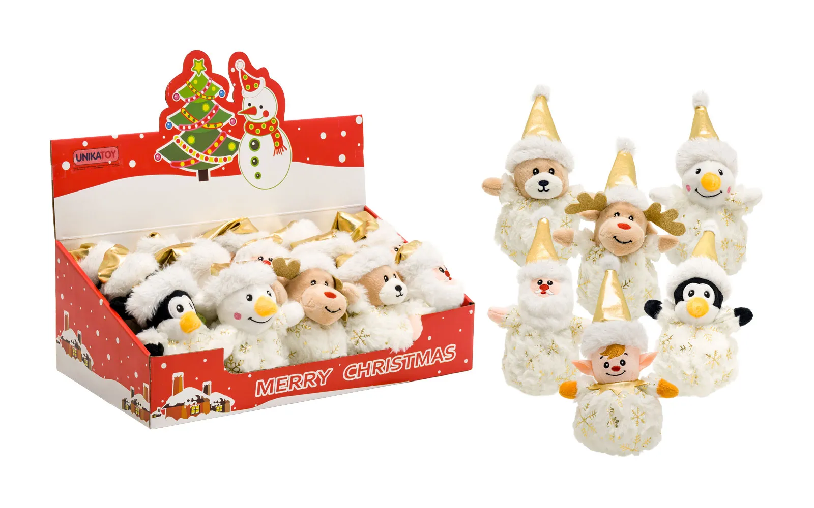 Plišane božićne figure veličine su 12 centimetara i bijele su boje. Imaju tople kape i predivne zlatne detalje koji im daju praznični sjaj. Izuzetno su mekane na dodir, pa će biti savršeni pratitelji za zimske dane i prekrasni ukras vašeg doma! Dostupne u različitim stilovima - medvjedić, jelenčić, snjegović, Djed Mraz, pingvin i patuljak.
