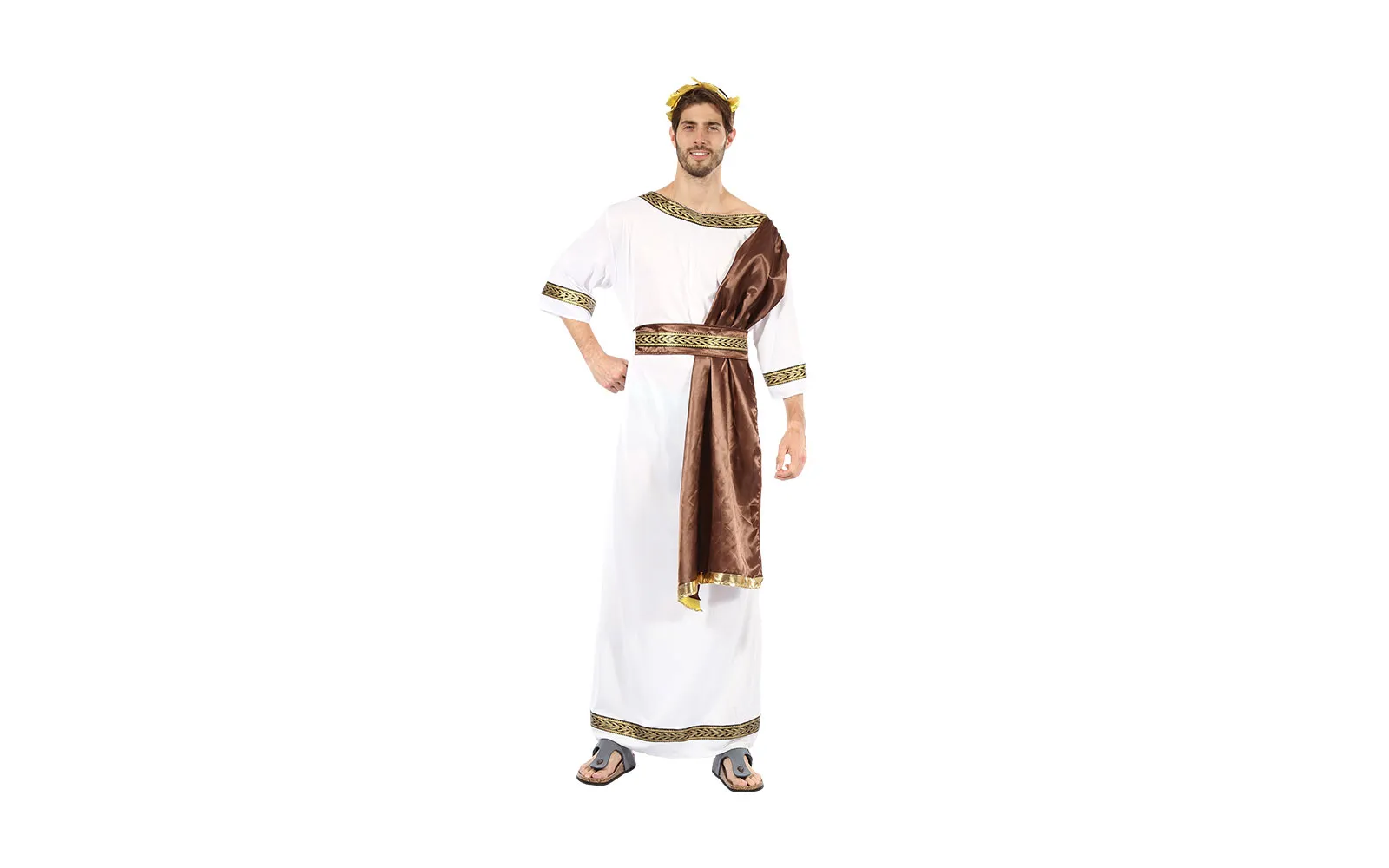 Pretvorite se u moćnog grčkog boga s ovim impresivnim kostimom za odrasle! Elegantna bijela tunika sa zlatnim detaljima, pojasom i vijencem za glavu istaknut će vaš božanski izgled. Idealna izbor za karnevalske zabave, tematske večeri ili kazališne nastupe. Udoban i lagan materijal osigurava bezbrižno nošenje. Cipele nisu uključene.