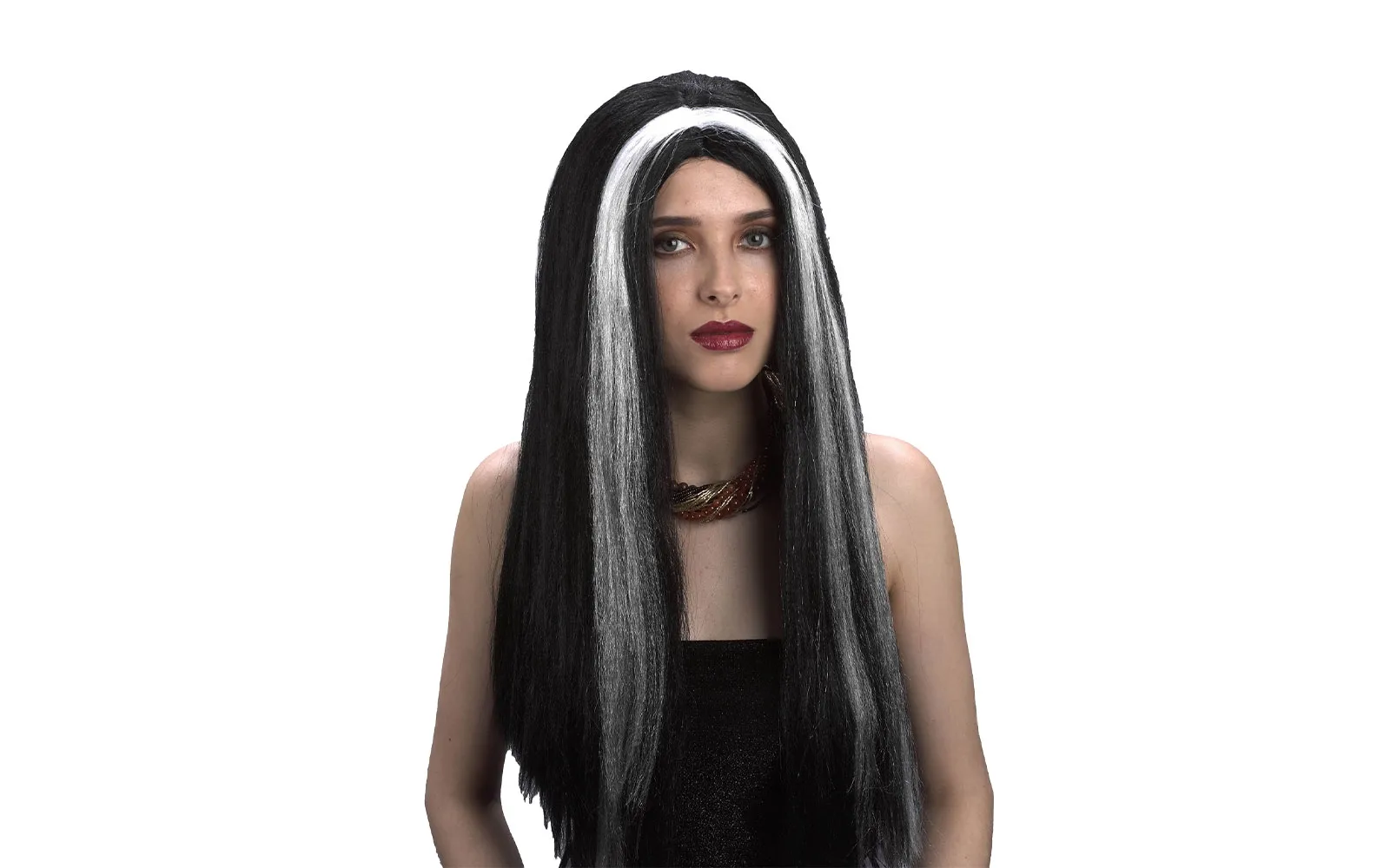 Dodaj svojem čarobnjačkom kostimu točku na i s dugom, tajanstvenom perikom! Tamna, ravna kosa s bijelim pramenovima dolazi daleko preko ramena i stvara savršen izgled tajanstvene vještice. Odličan izbor za noć vještica, karneval ili tematske zabave.