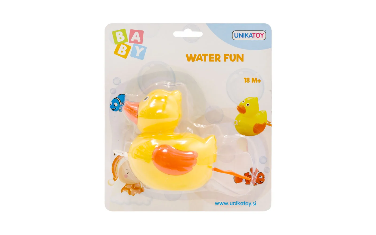 Patka dužine oko 14 cm u boji jarko narančaste boje s konopcem za povlačenje. Stavite patku u vodu, povucite konopac, pustite i patka će se kretati po vodi. Preporučujemo djeci od 18. mjeseca starosti nadalje - uporaba pod stalnim nadzorom odrasle osobe.
