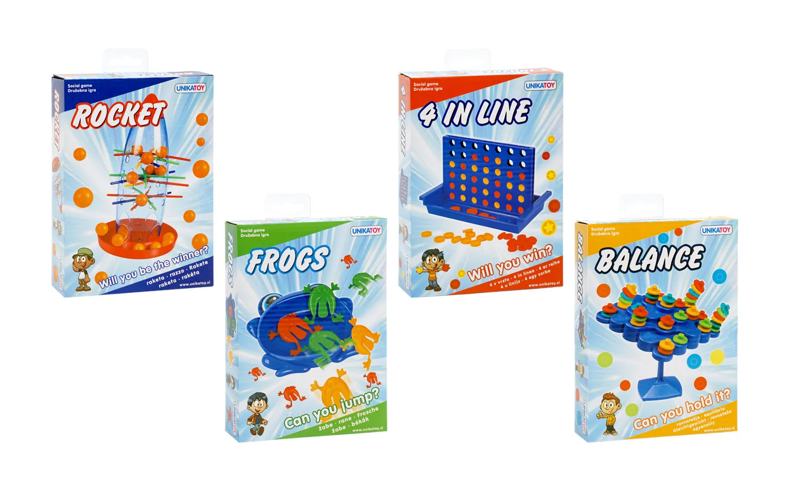 Miks pet različitih malih društvenih igara: igra četiri u nizu, ravnoteža, raketa ili žabice.