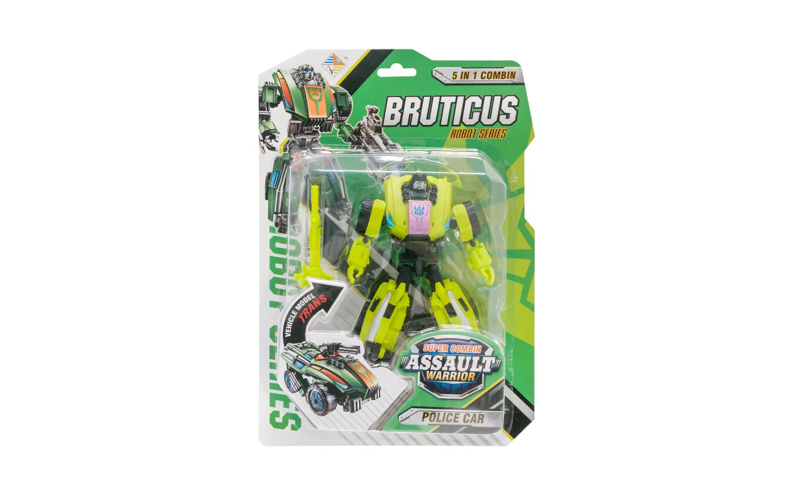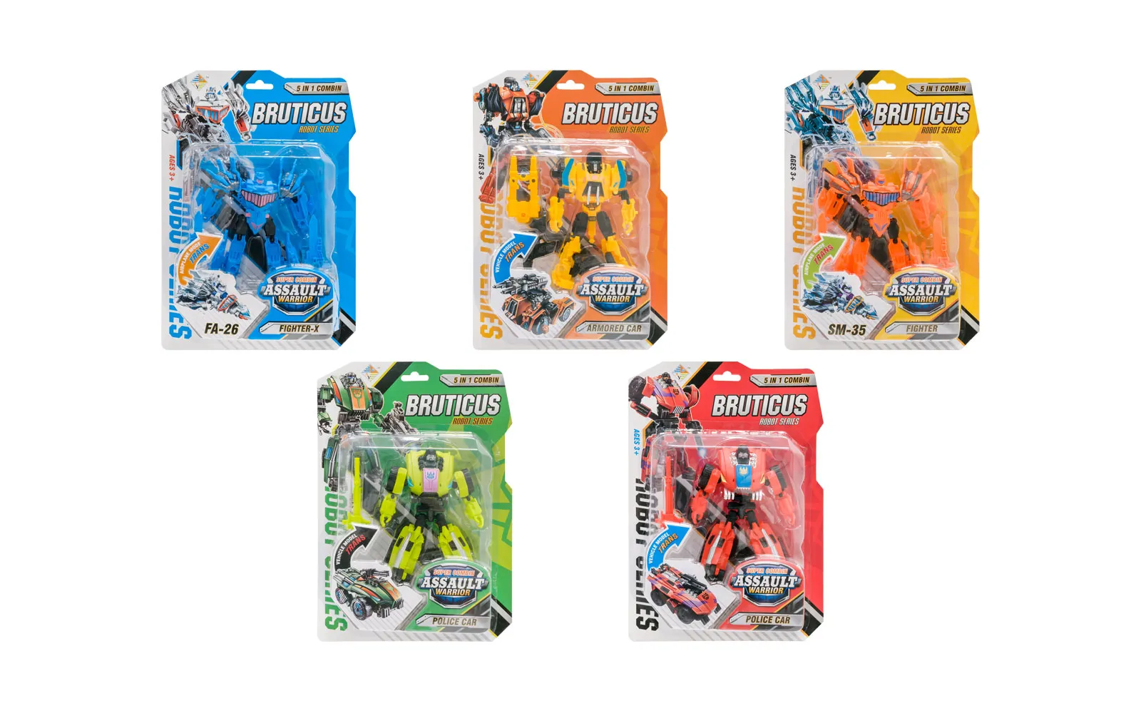 Pet različitih stilova, različitih boja robota Bruticusa, koji se pretvara u vozilo. Pomozite si s slikama na pakiranju kada mijenjate robota u vozilo ili obrnuto. Ako spojite 5 različitih transformera zajedno, dobivate autentičnog x- mana.