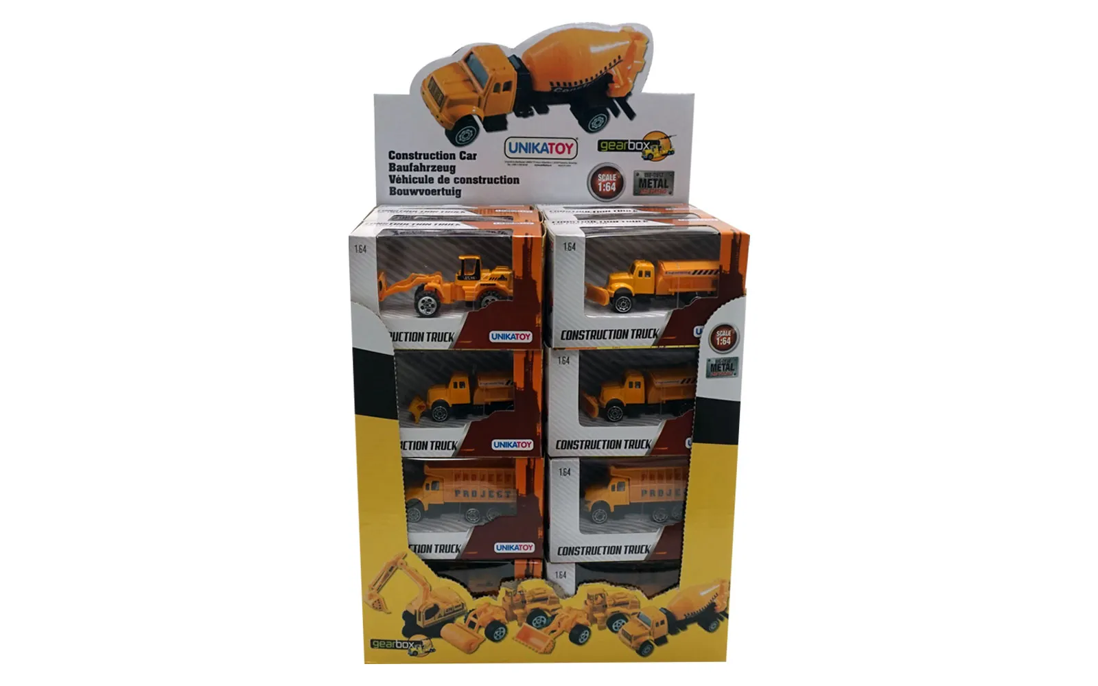 6 različitih stilova građevinskih vozila u omjeru 1:64. Metalna vozila s pojedinačnim plastičnim dijelovima imaju slobodan hod kotača.