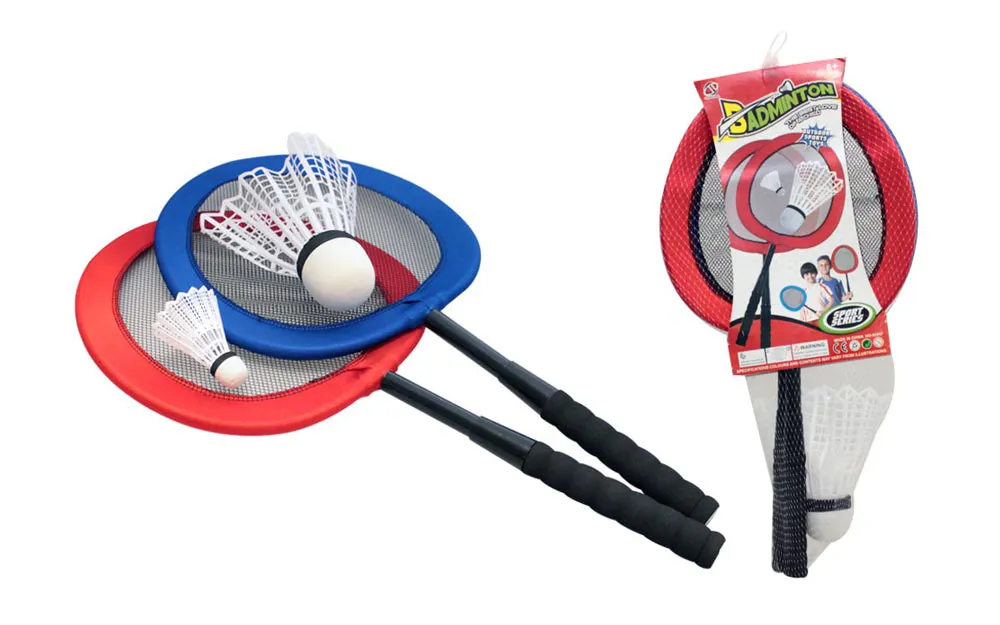 Komplet za badminton sadrži dva reketa u crvenoj i plavoj boji te jednu veliku i jednu malu plastičnu lopticu za badminton. Reket je dug 65 cm, mala loptica je duga 9 cm, velika loptica je duga 21 cm.