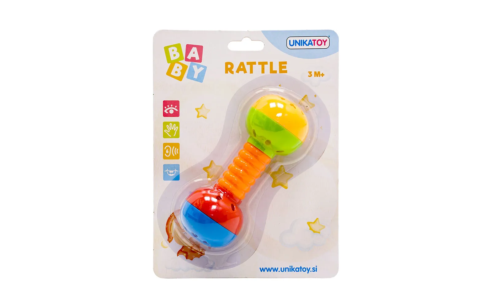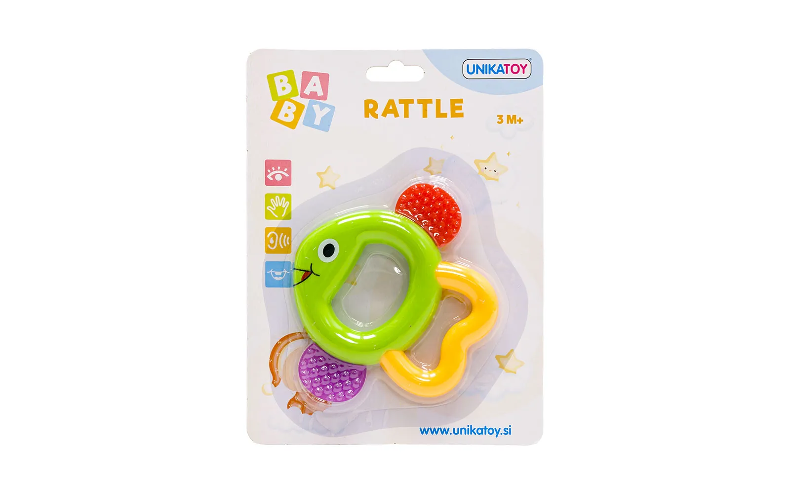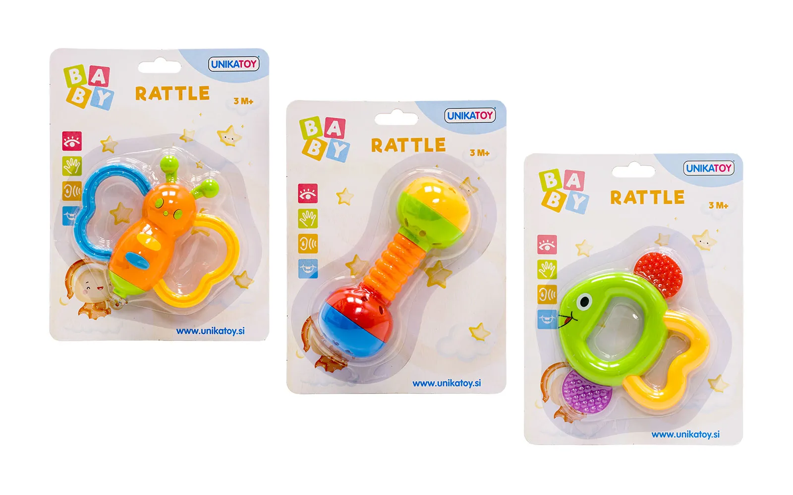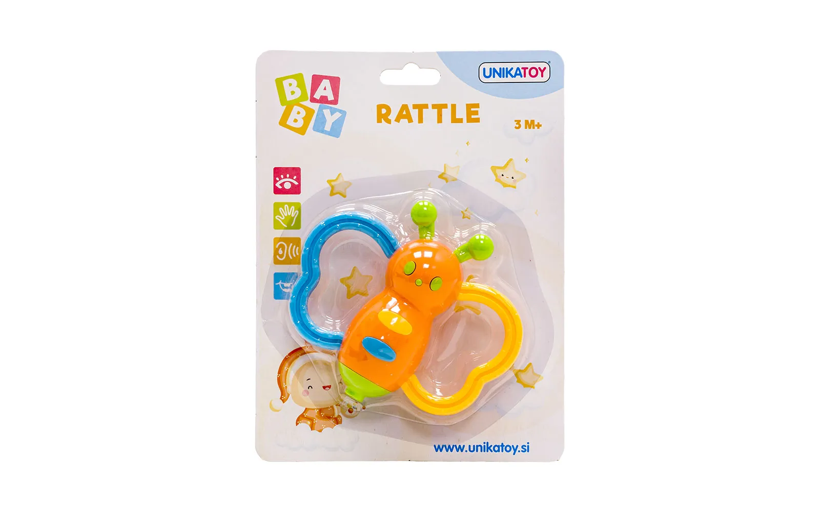 Dječja zvečka je dostupna u tri različita oblika: riba, leptir i klasična zvečka. Potiče razvoj sluha i vida kod djece te prepoznavanje oblika i boja. Odlično utječe na razvoj dječjih motoričnih sposobnosti. Primjerena je za djecu stariju od 3 mjeseca.