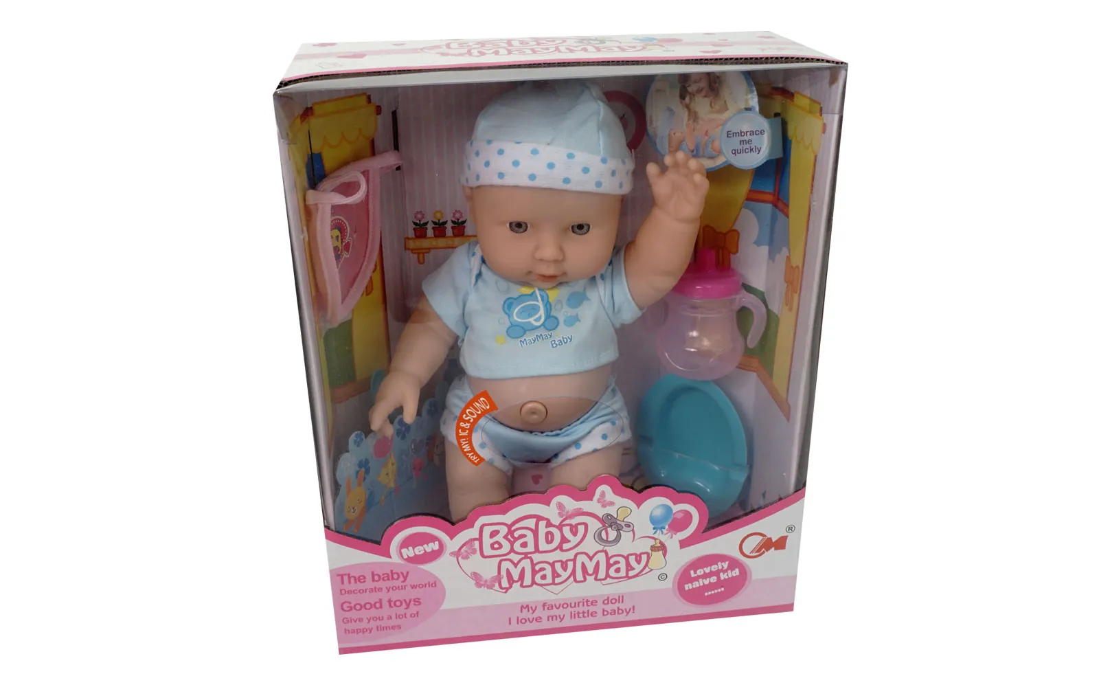 Simpatična beba s kapicom obučena u odjeću plave boje, veličine je 30 cm. Kada pritisnete na nju ispušta zvukove. Uz bebicu su priloženi i različiti dodaci.