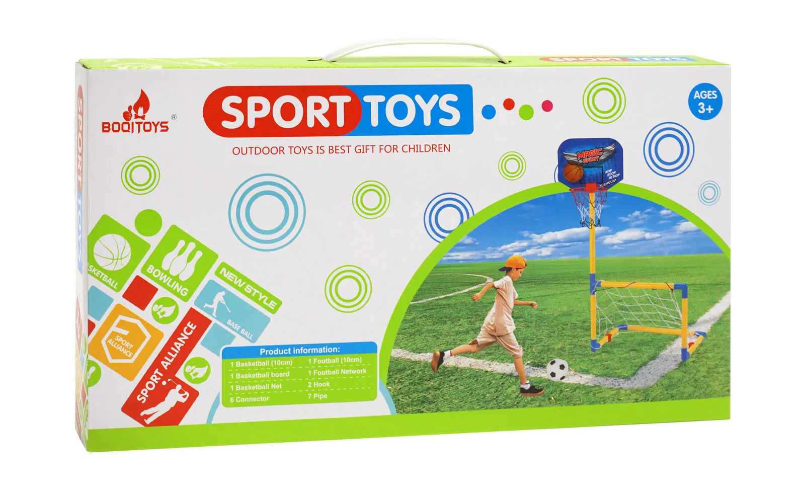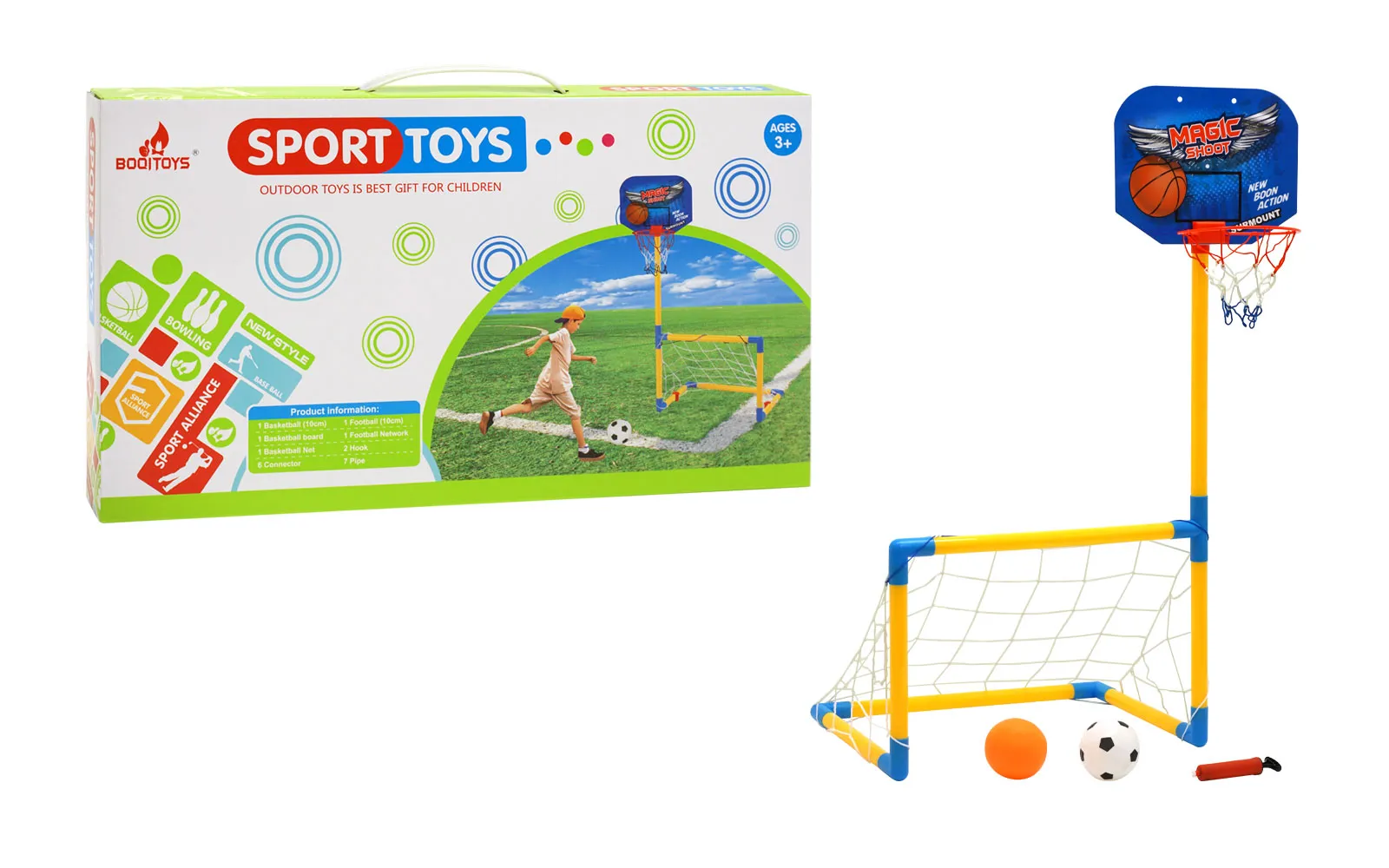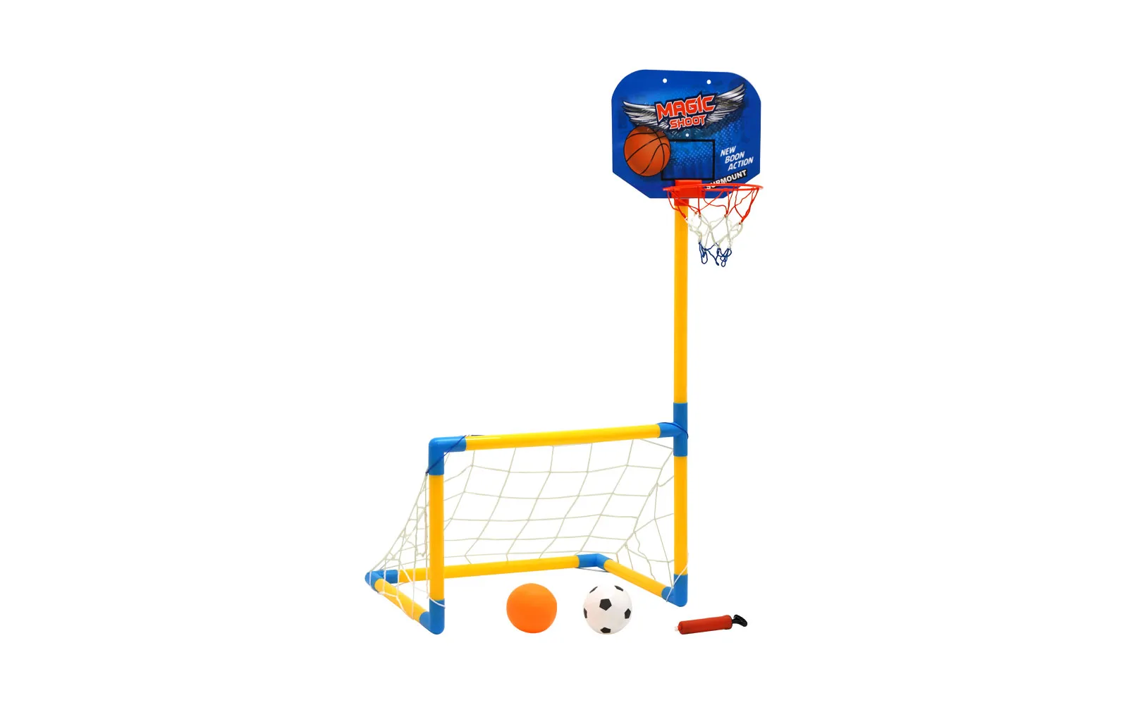 Set sadrži 1 košarkašku loptu fi 10 cm, 1 nogometnu loptu fi 10 cm, pumpu te gol zajedno sa košem dimenzija 48x97x34 cm. Baci loptu na koš ili šutni loptu u gol. Odluka je tvoja. Gol-koš možeš postaviti u stan, ali ako koristiš priložene klinove, možeš se zabaviti i na travi. Stupovi gola i spojke su napravljeni od PVC materijala.