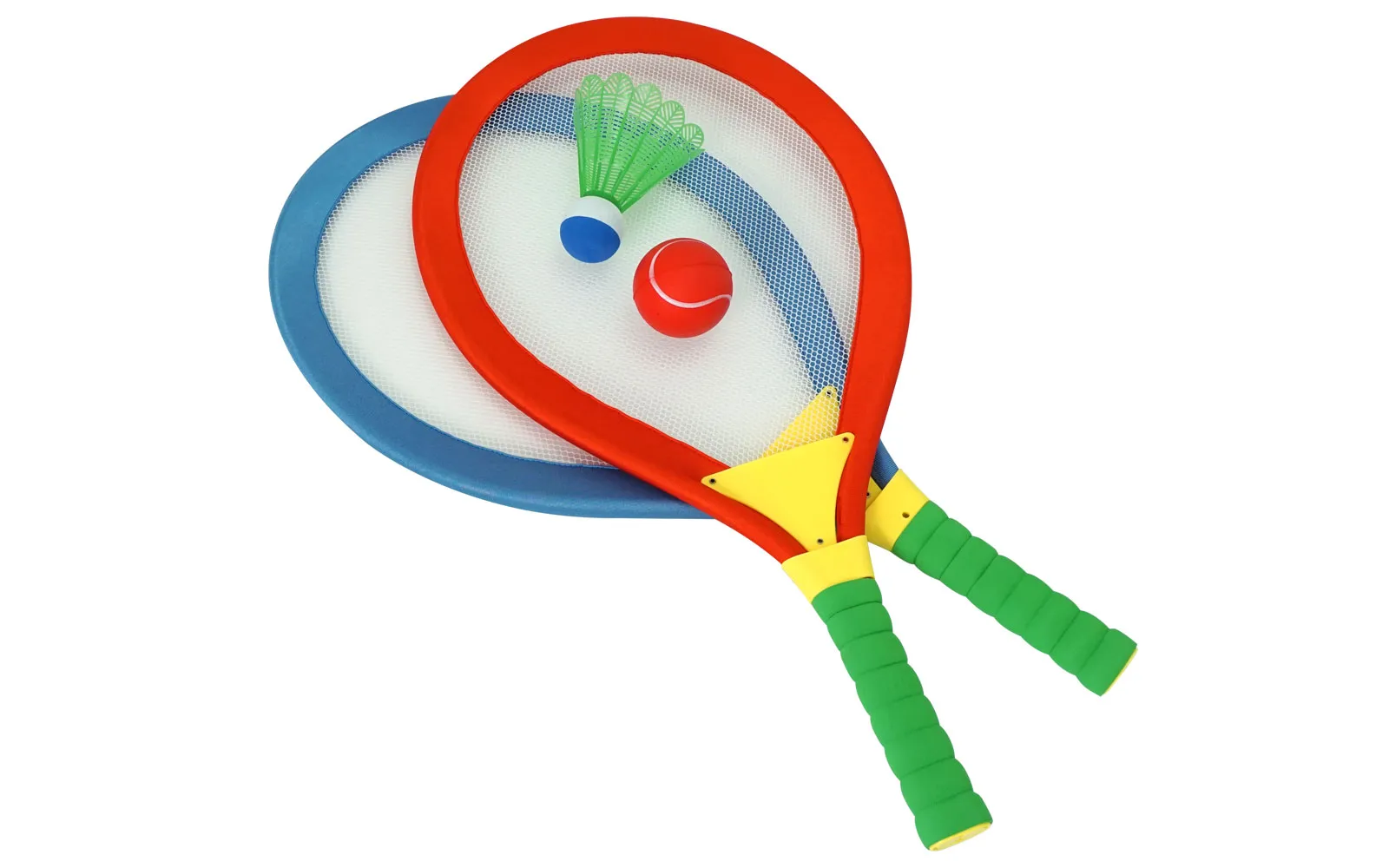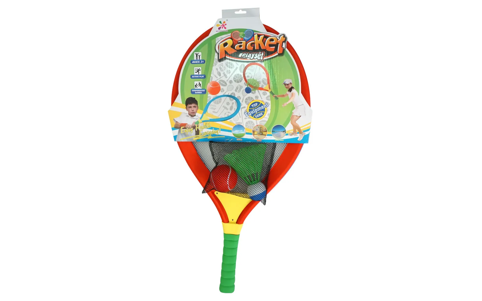 Komplet dva reketa s vrlo mekanom okruglom lopticom te jednom pvc lopticom za badminton. Reket je dug 70,5 cm, mekana okrugla loptica ima promjer od 7 cm, a pvc badminton loptica je duga oko 13,5 cm.