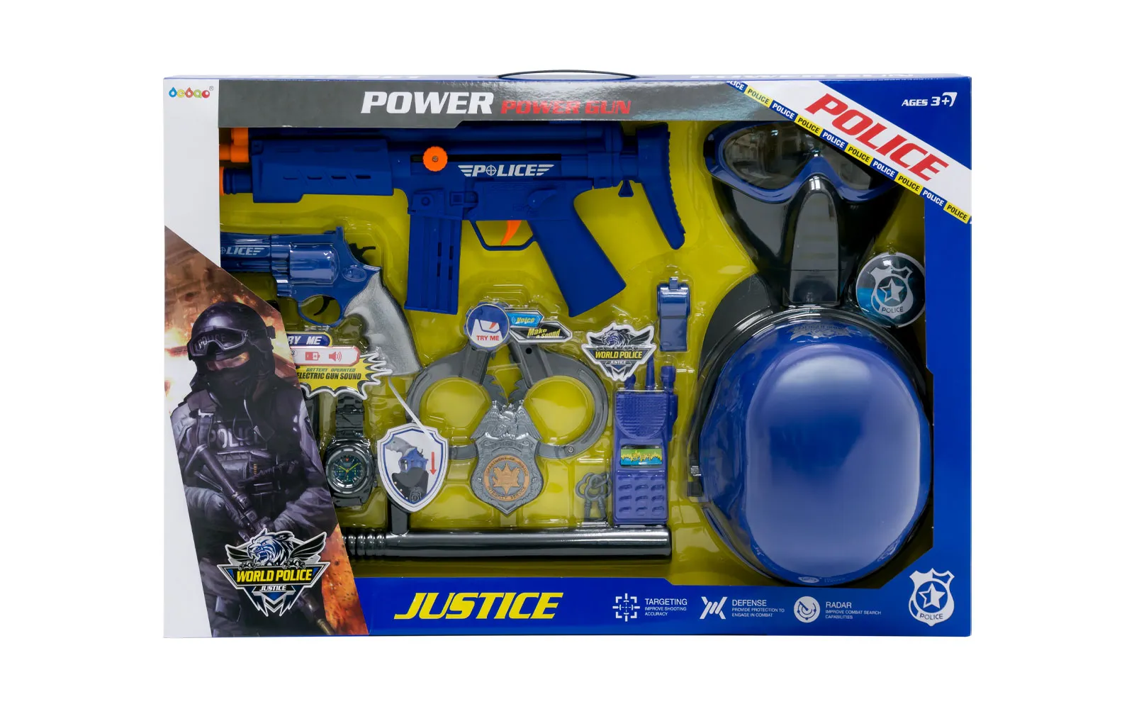 Policajski set bogat sadržajem s kacigom, brzopoteznim puškom i pištoljem sa zvukom. Za rad pištolja potrebne su 2 baterije tipa AG13/LR44 1.5V, koje su priložene za demonstracijske svrhe.