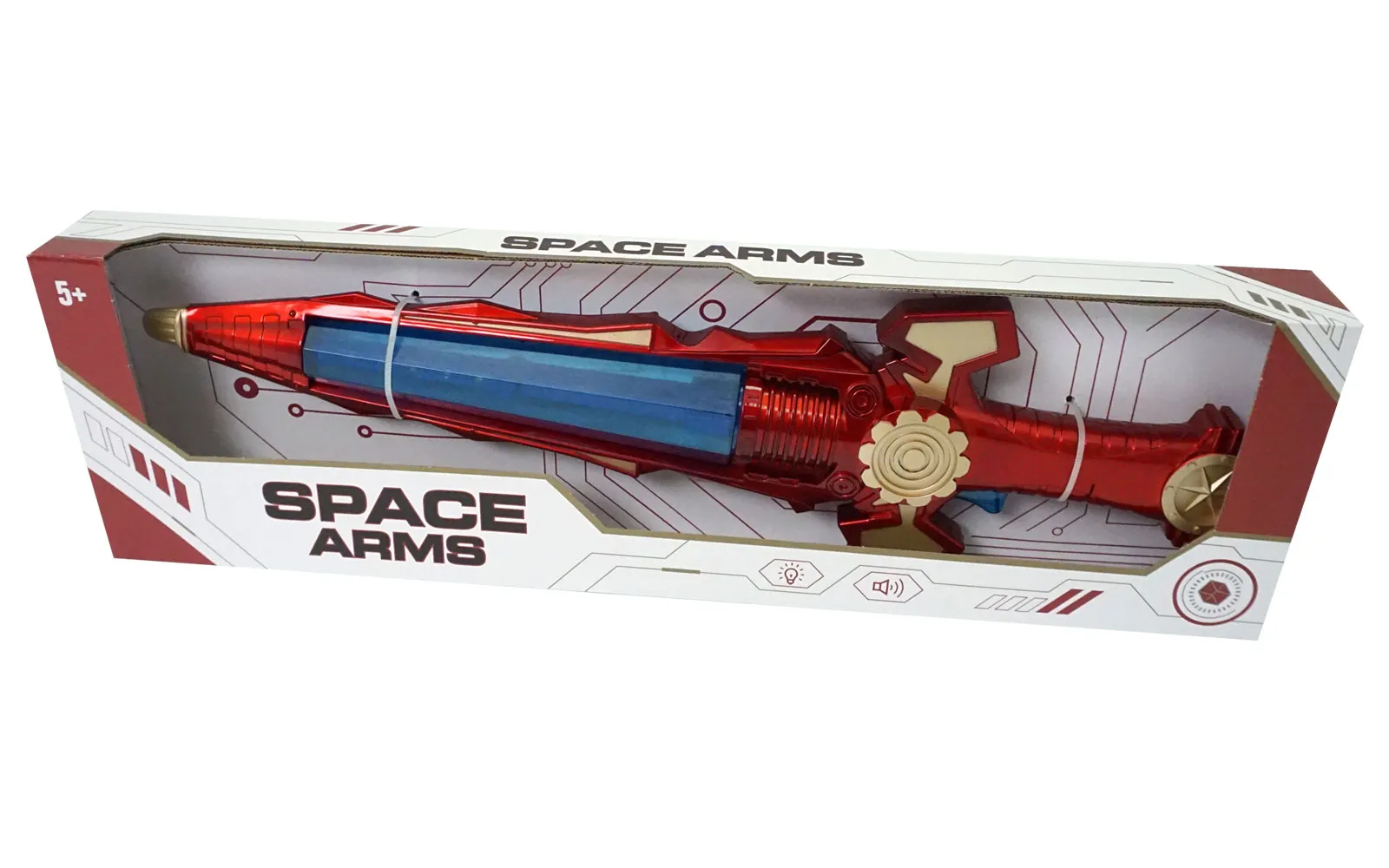 Svemirski mač od baterije crvene, zlatne i plave boje veličine 50 cm ima zvuk, trepćuće svjetla i okretni unutarnji dio. Za rad su potrebne 3 baterije tipa AA 1.5V, koje nisu uključene.