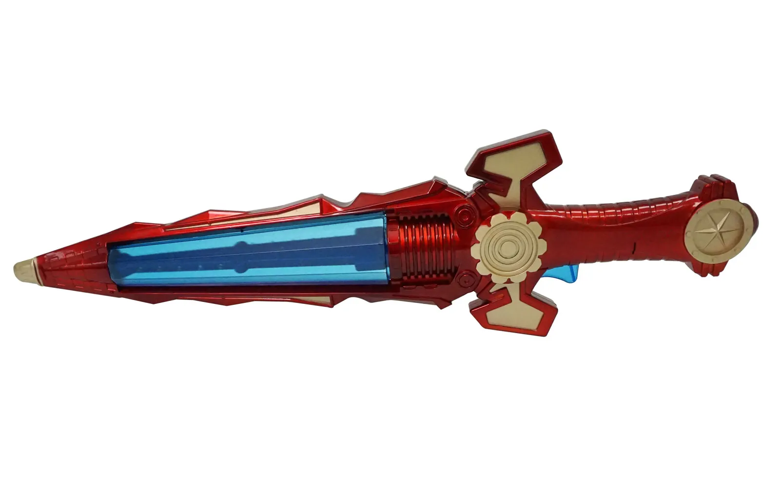 Svemirski mač sa baterijom u crvenoj, zlatnoj i plavoj boji veličine 50 cm ima zvuk, trepćuće svjetla i vrtljivi unutarnji dio. Za rad je potrebno 3 baterije tipa AA 1.5V, koje nisu uključene.