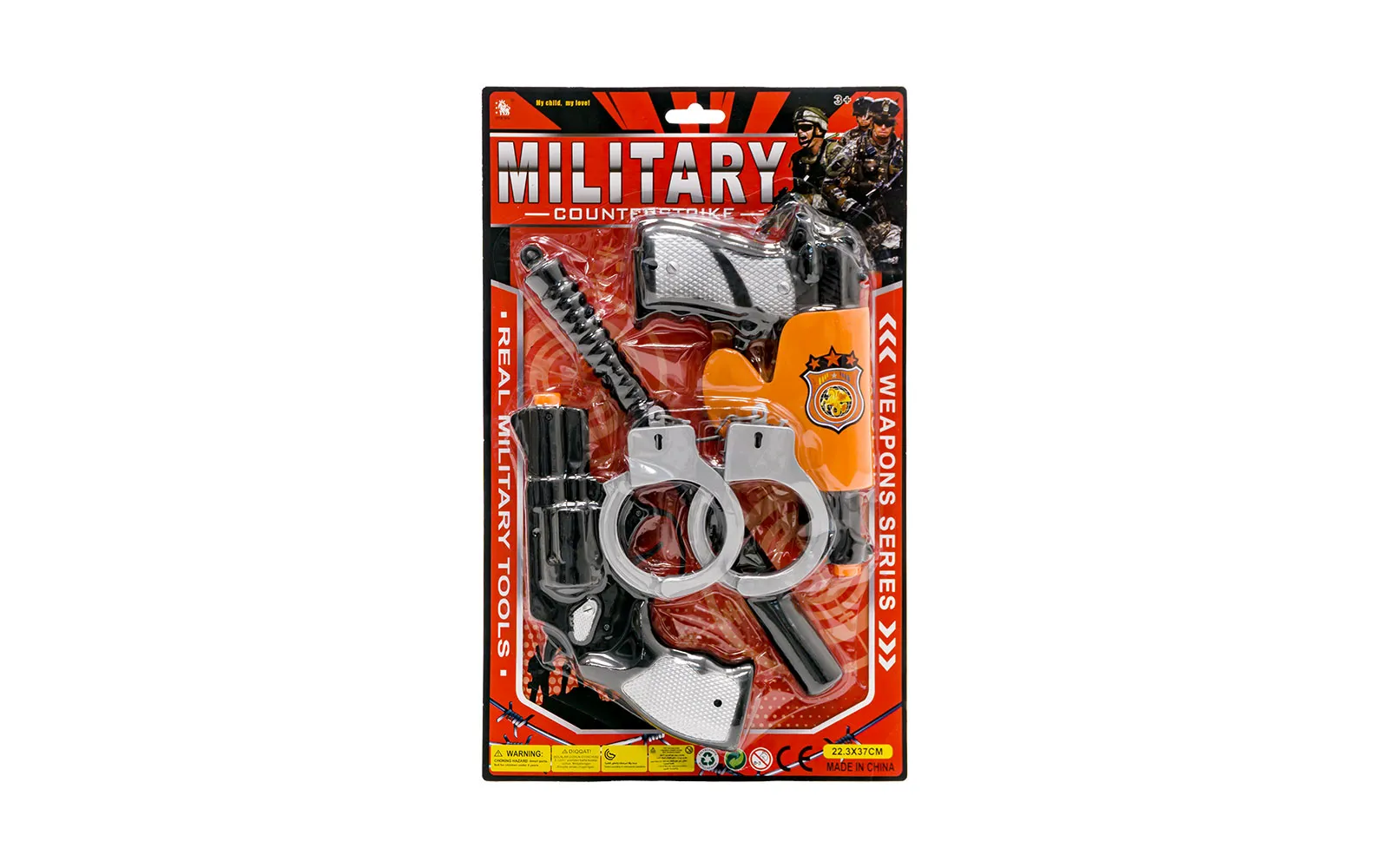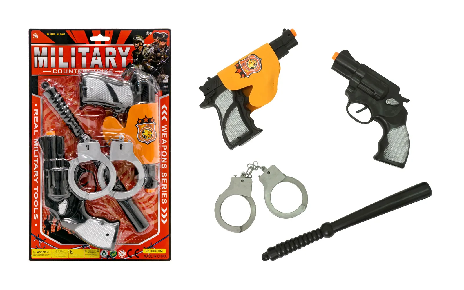 Set različitih policijskih pomagala među kojima su dvije pištolje, lisice, pendrek i još ponešto.