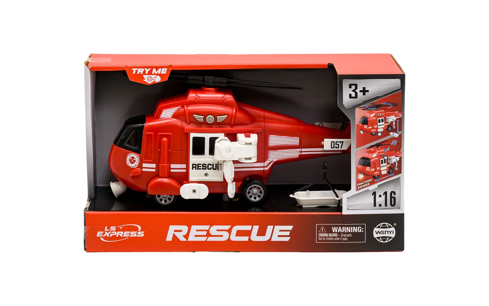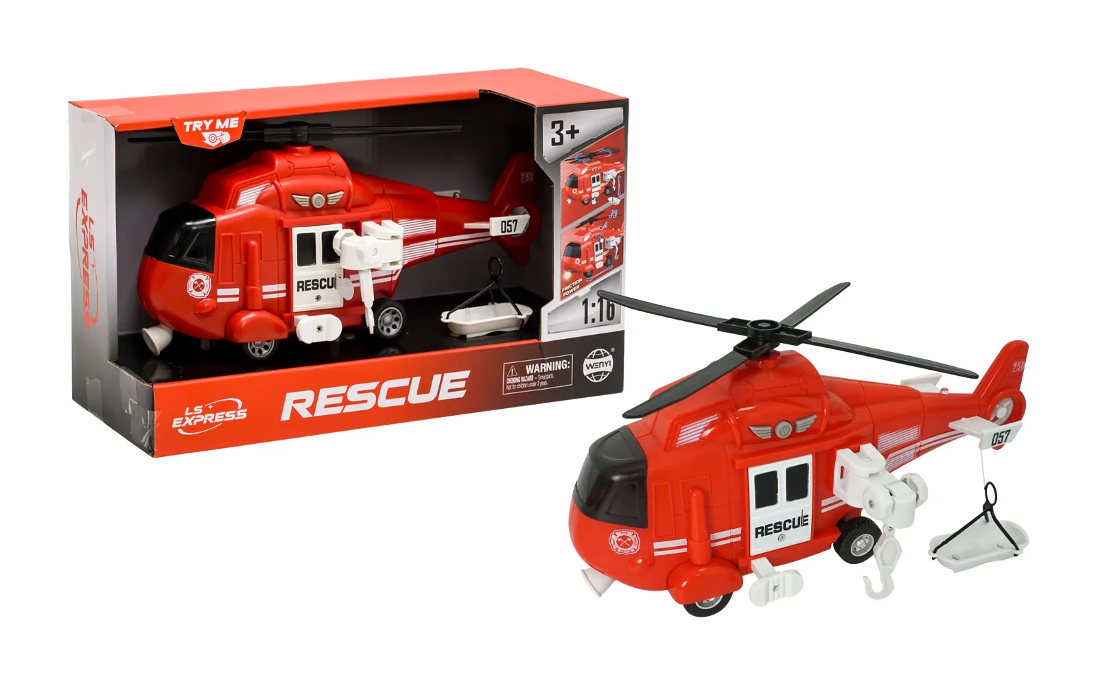 Spasilac helikopter na baterije veličine 30 cm za rad treba 3 baterije tipa AG13 (LR44) 1.5V. Pritisnite gumb iznad vrata. Čut će se zvuk, svijetlit će dvije lampice. Pritiskom bijelog gumba rotira se rotor na helikopteru. Pomoću okretanja dvaju malih bijelih gumba podižete ili spuštate priloženo spasilacko nosilo. Vozilo ima pogon na trenje.
