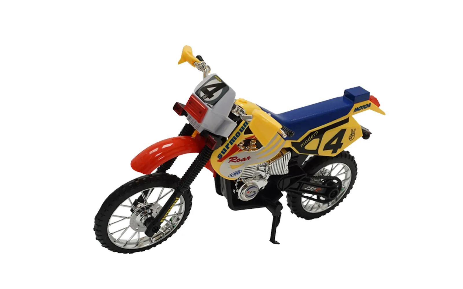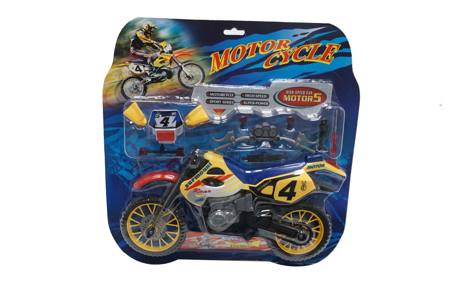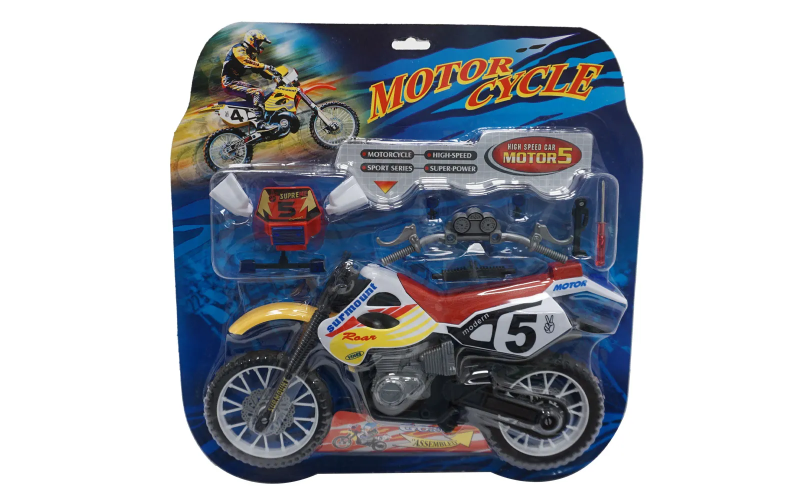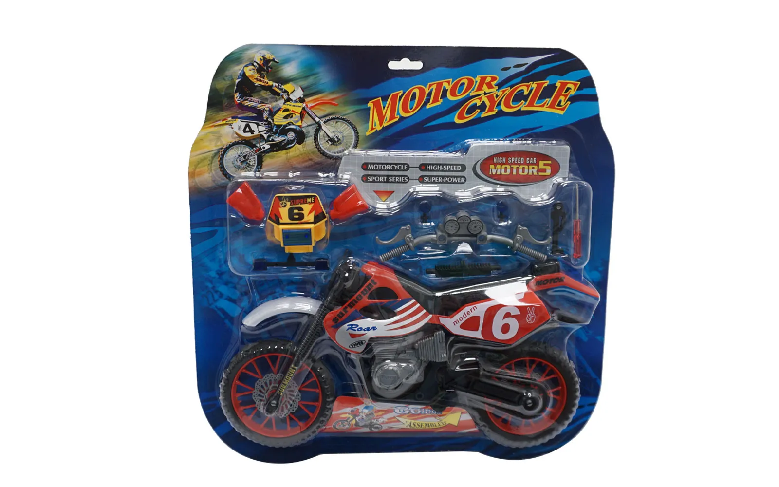 Set sadrži motor za kros slobodnog toka kotača s priloženim dijelovima i alatom za sastavljanje. Motor za kros dostupan je u tri različite boje. Veličina motora je otprilike 35 cm.