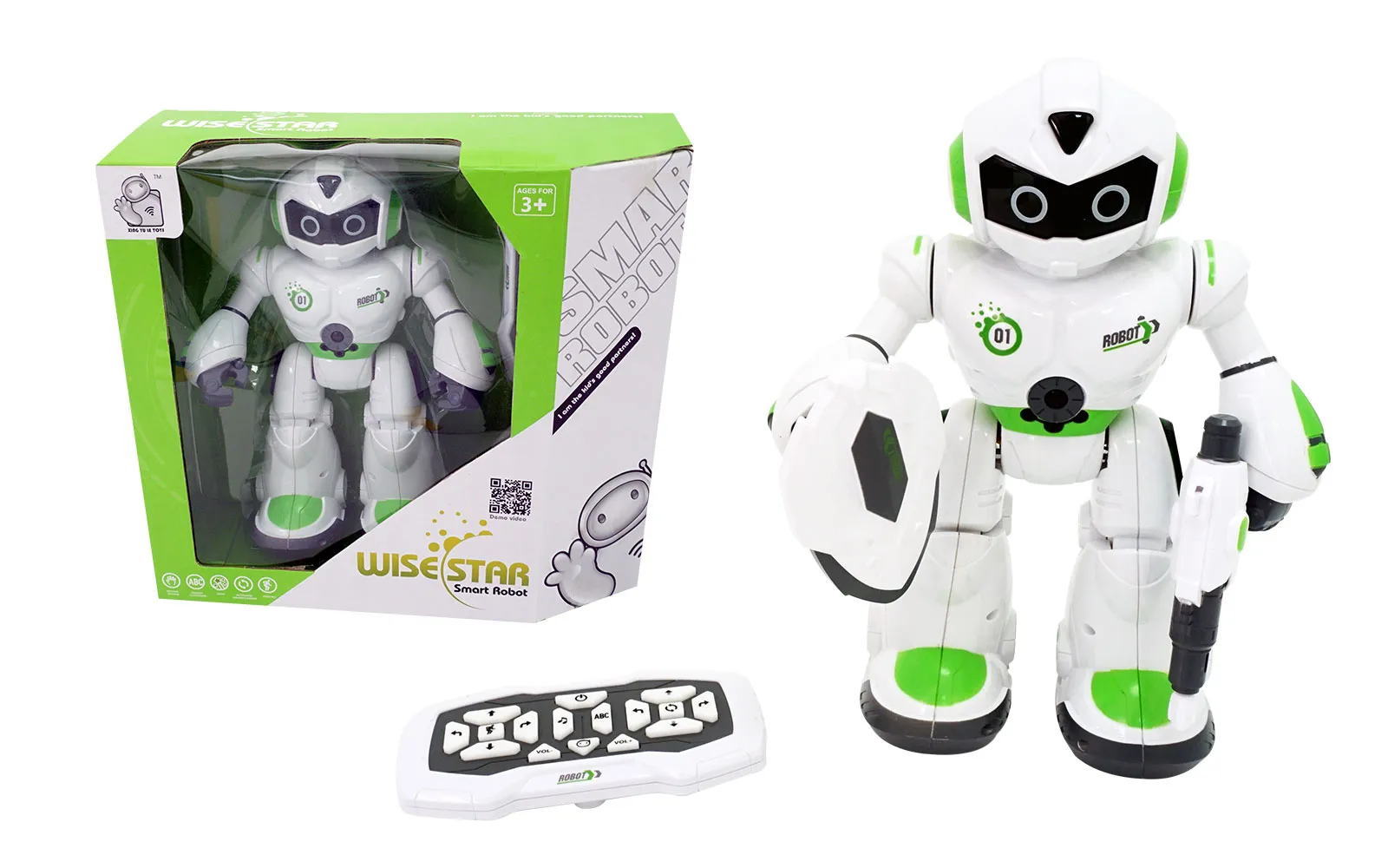 ROBOT WISESTAR NA DALJINSKO UPRAVLJANJE! Otkrijte čarobni svijet robotike s Robotom Wisestar! Ovaj 26 cm visoki daljinski robot sjajan je izbor za sve mlade istraživače koji žele interaktivnog i zabavnog druženja. INTERAKTIVNA IGRA I ZABAVA: Robot se pali jednostavnim pritiskom na gumb ON, što aktivira svjetlosne efekte i zabavne zvukove. Sposobnosti Robota Wisestar uključuju kretanje lijevo, desno, naprijed i natrag, ali i govori, pjeva i pleše! Uživajte u nezaboravnim trenucima dok pjeva i pleše. UČENJE I KREATIVNOST: Robot također ima funkciju upravljanja pokretima ruku, što omogućuje bolju interakciju i kreativnu igru. Daljinski upravljač omogućava lako upravljanje Robotom na daljinu, što je idealno za grupnu igru ili samostalno istraživanje. SAMOISKLJUČIVANJE: Da bi igra bila još praktičnija, robot se automatski isključuje nakon određenog vremena, čime produžava životni vijek baterija. TEHNIČKE SPECIFIKACIJE: radi na 3 baterije tipa AA 1.5 V (nisu priložene), daljinski upravljač radi na 2 baterije tipa AA 1.5 V (nisu priložene). Robot Wisestar na daljinsko upravljanje pravi je izbor za sve djecu koja žele zabavu i učenje kroz igru!