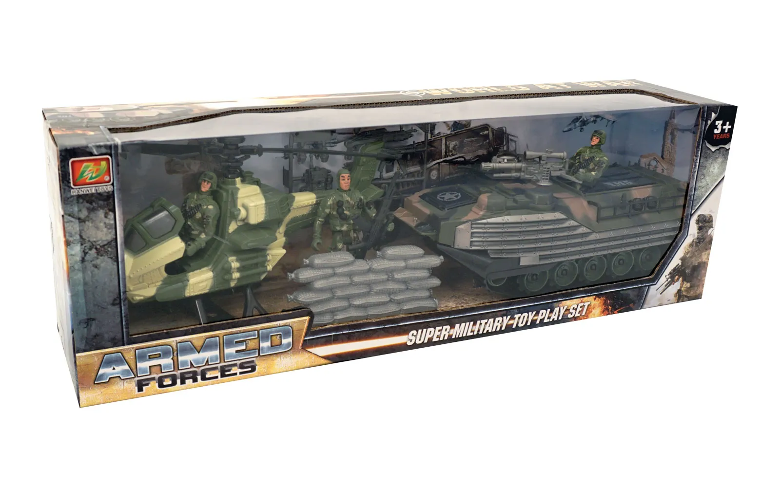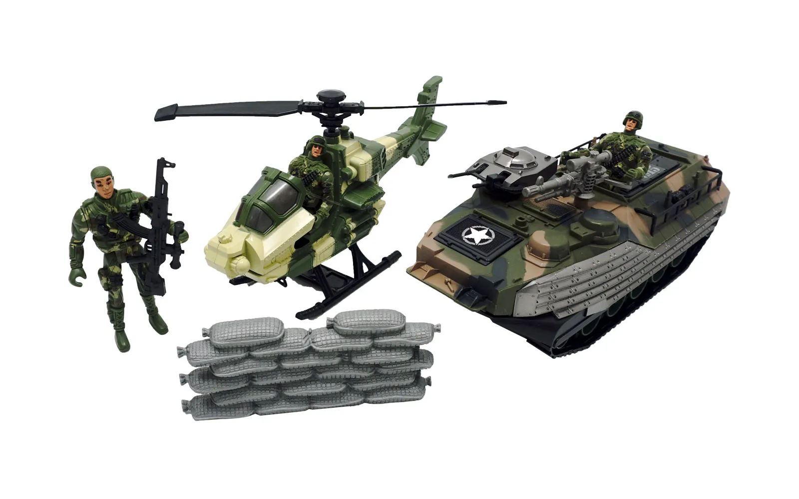 S vojnim setom možeš prikazati najveće vojne bitke u povijesti. Set sadrži tri vojnika, tenk, helikopter, borbeni štit i oružje koje vojnici mogu vješto koristiti.