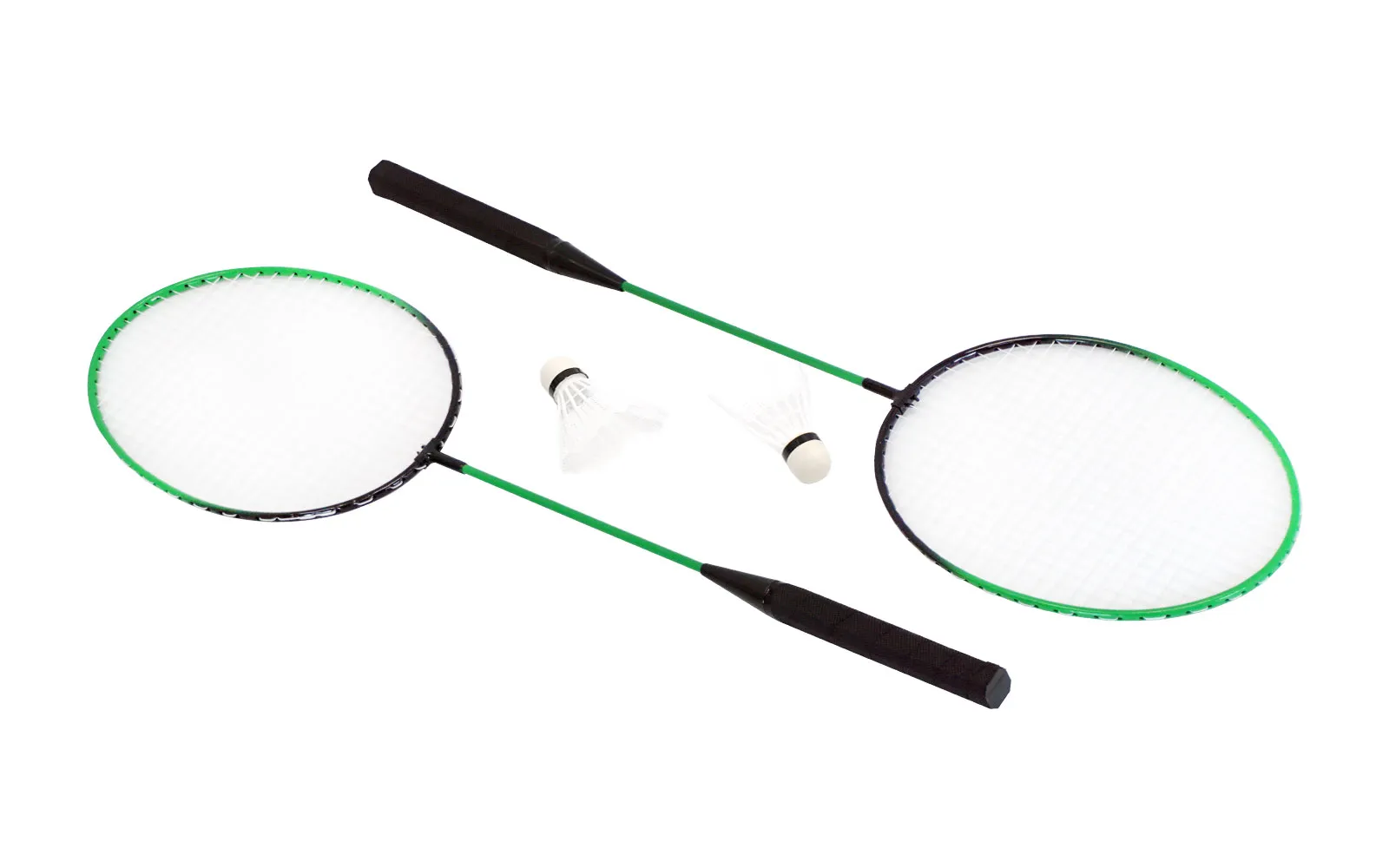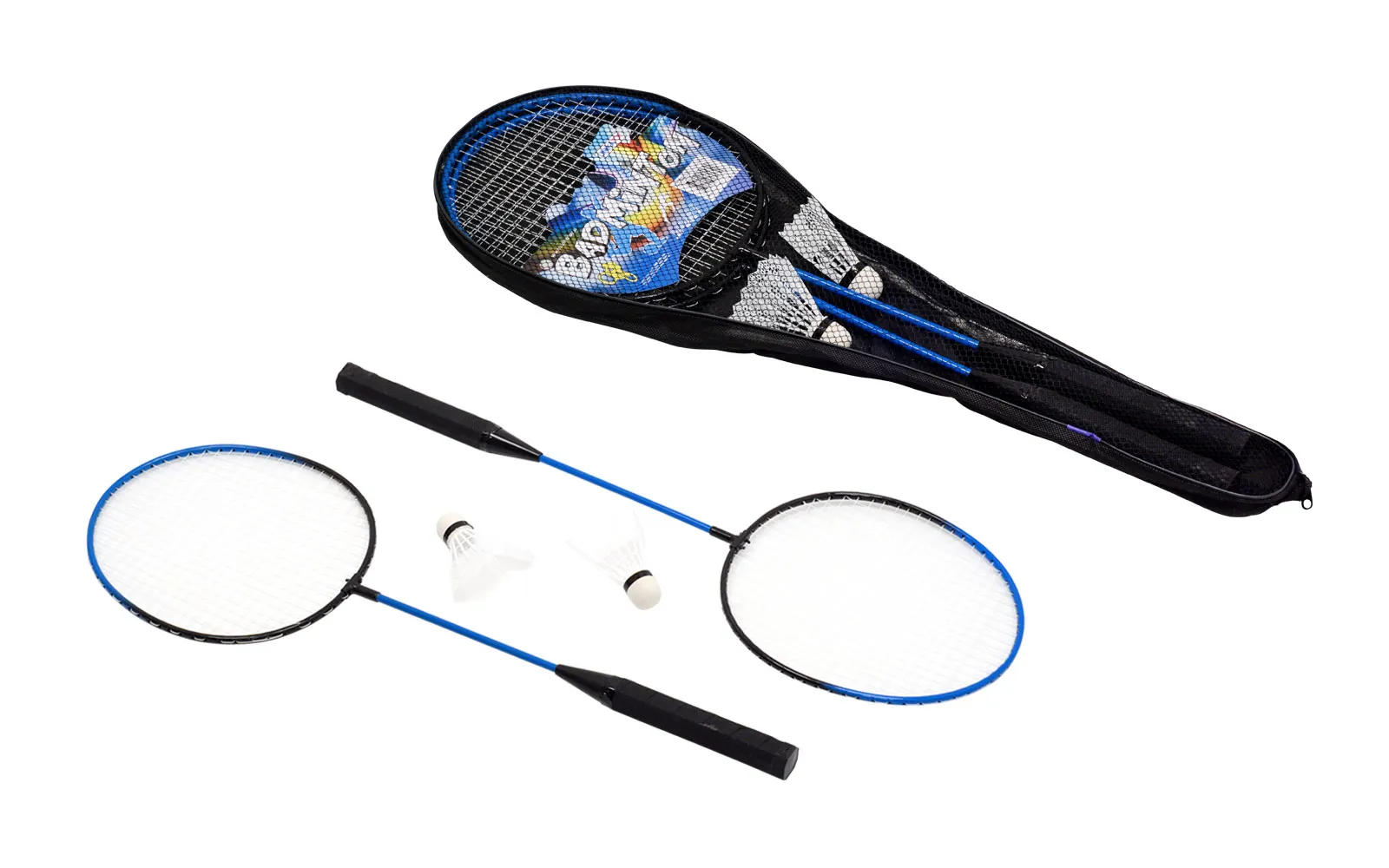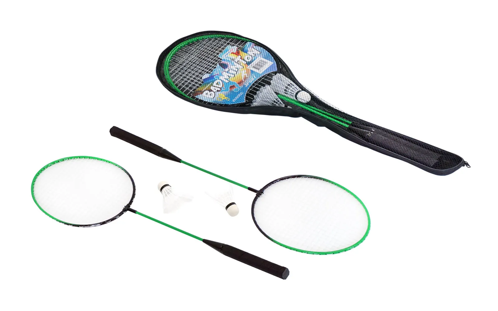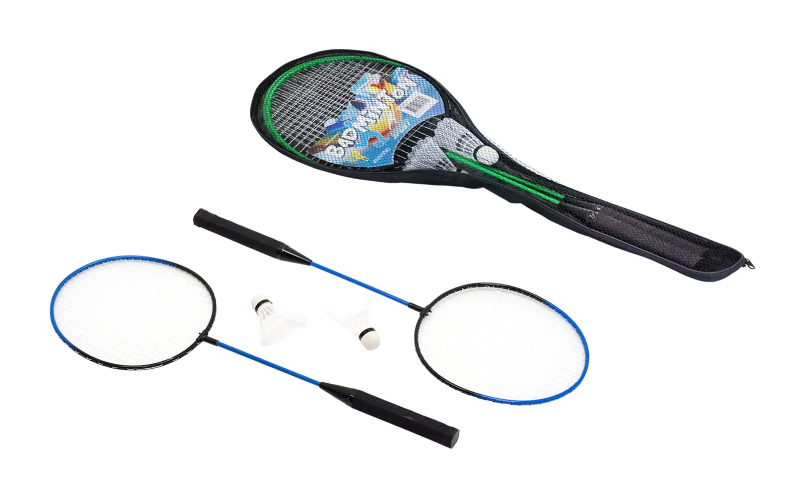 Set za badminton sadrži 2 reketa i 2 male PVC badmintonske loptice. Jedan reket je dug oko 60 cm, jedna mala PVC badmintonska loptica je duga oko 8 cm. Dostupno u plavoj ili zelenoj boji.
