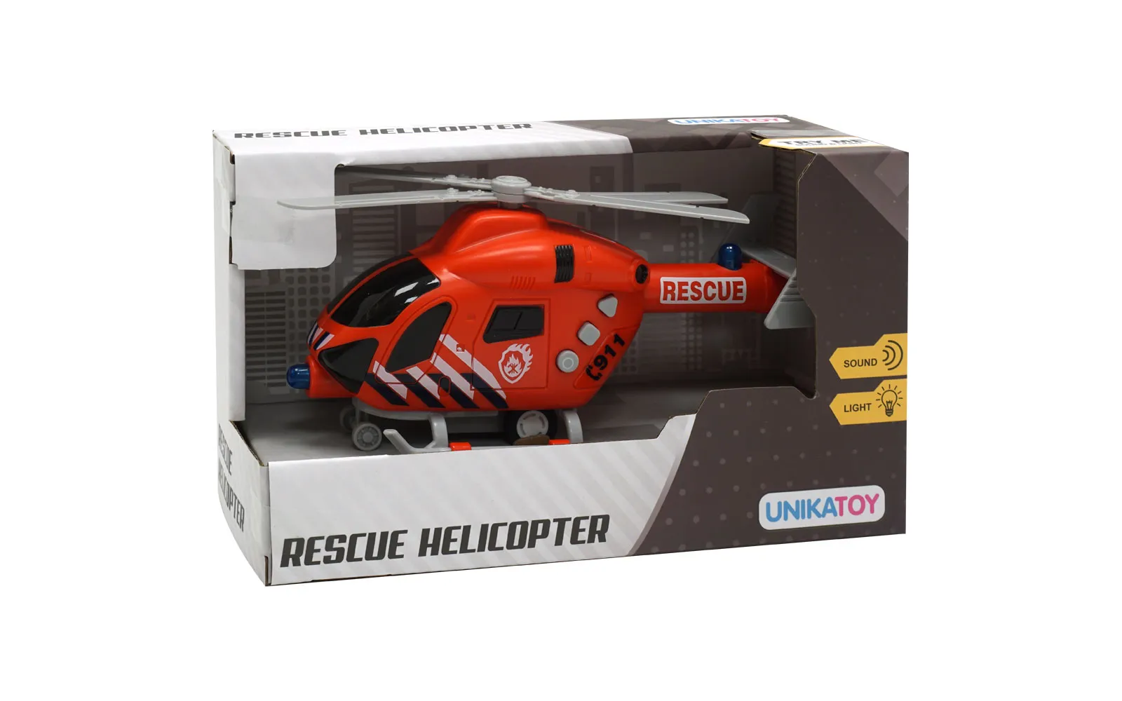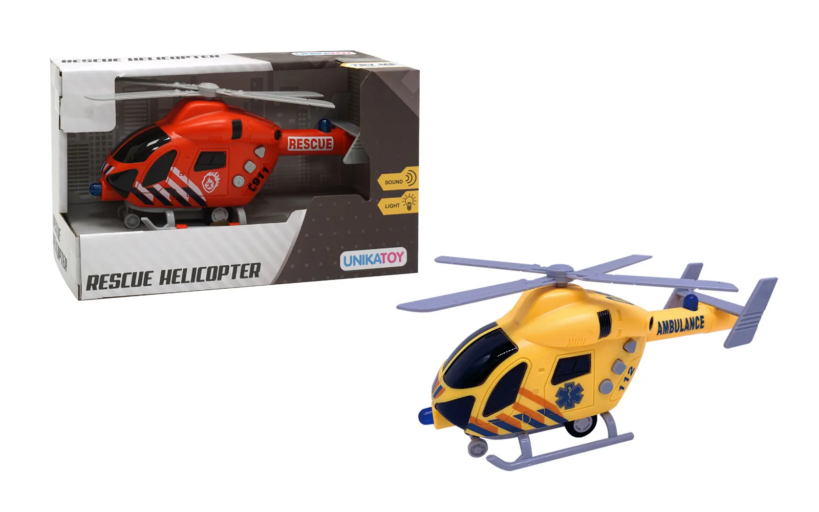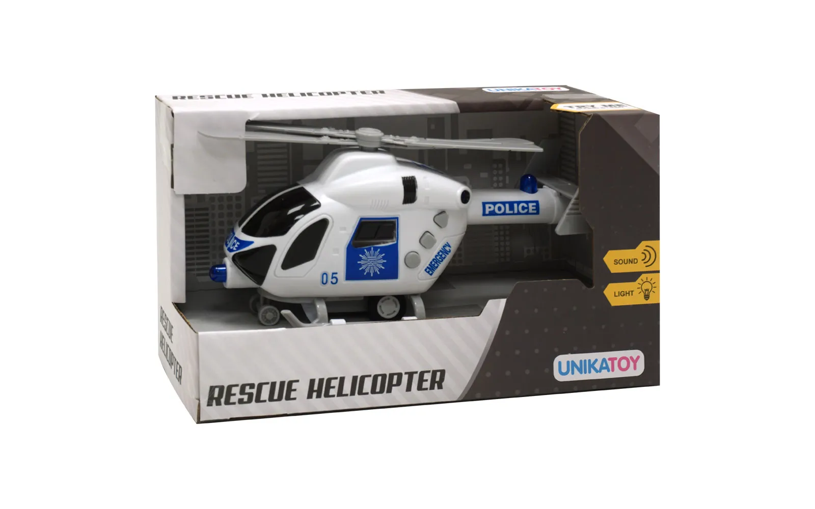 Helikopter za spašavanje veličine 19 cm, sa zvukom i svjetlima, priznatog brenda Unikatoy. Dostupan u 4 različita stila. Igračka je primjerena za djecu od 3 godine starosti.