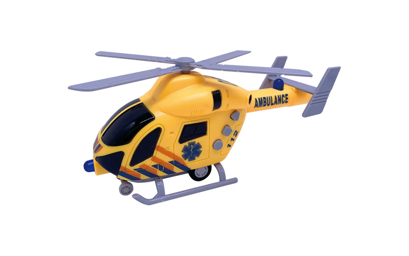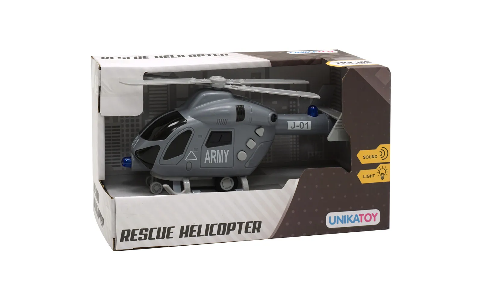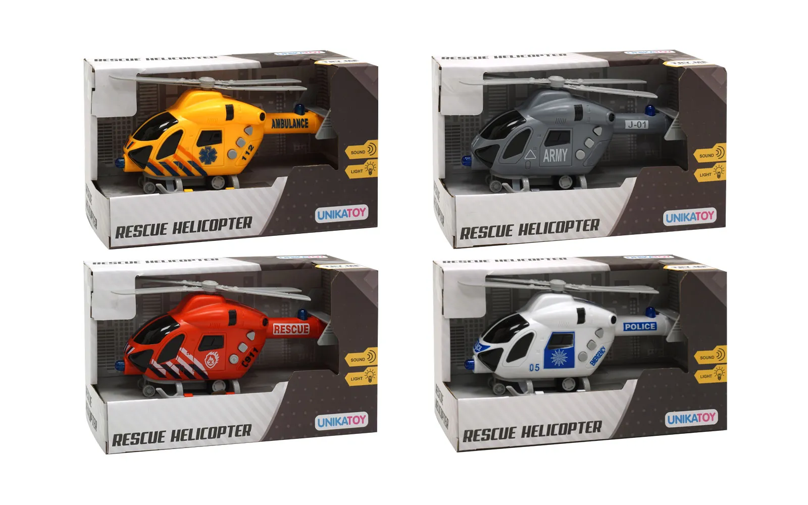 Helikopter za spašavanje veličine 19 cm, sa zvukom i svjetlima, priznatog brenda Unikatoy. Dostupan u 4 različita stila. Igračka je primjerena za djecu od 3 godine starosti.