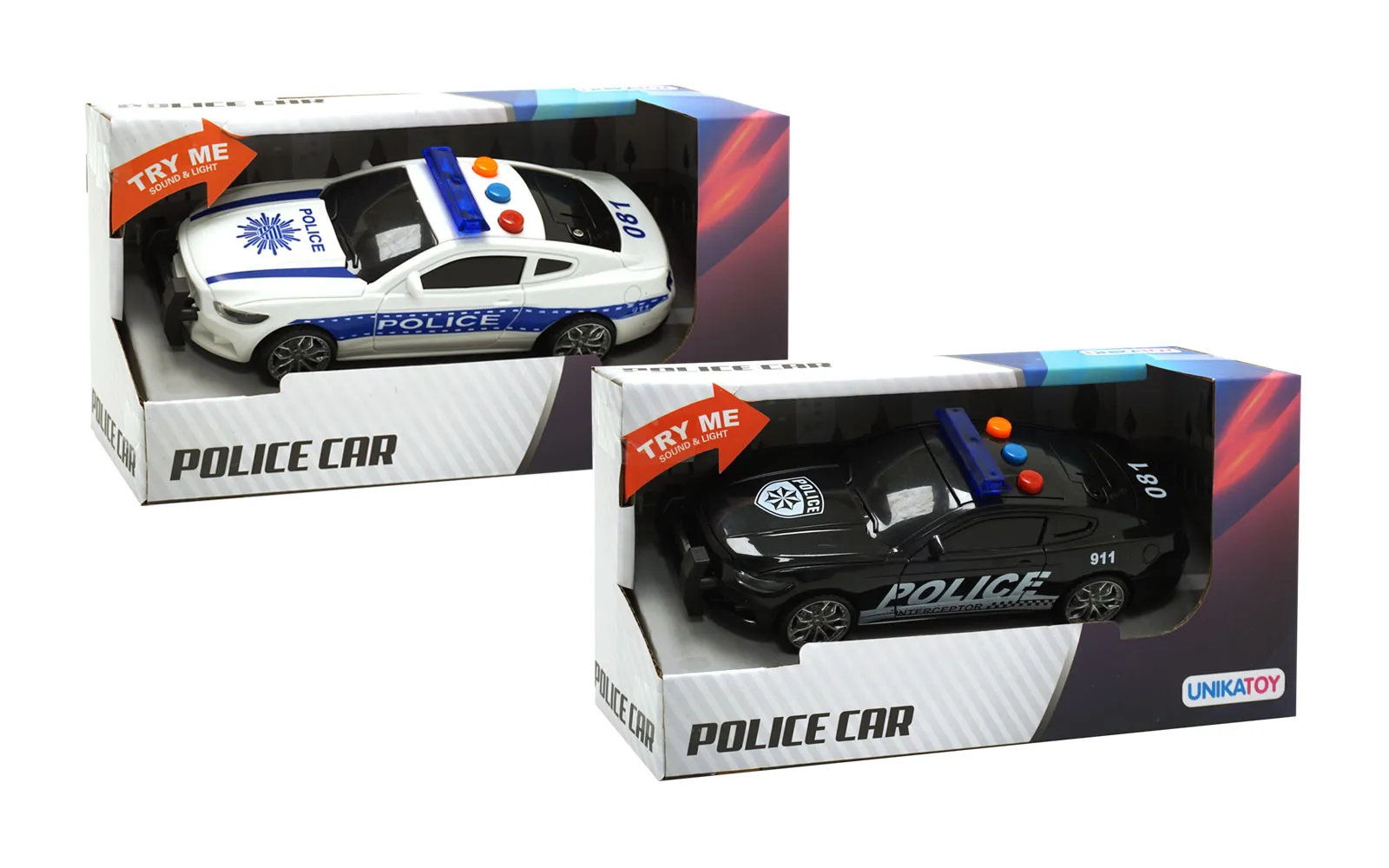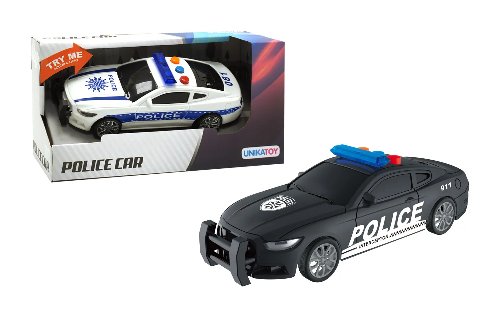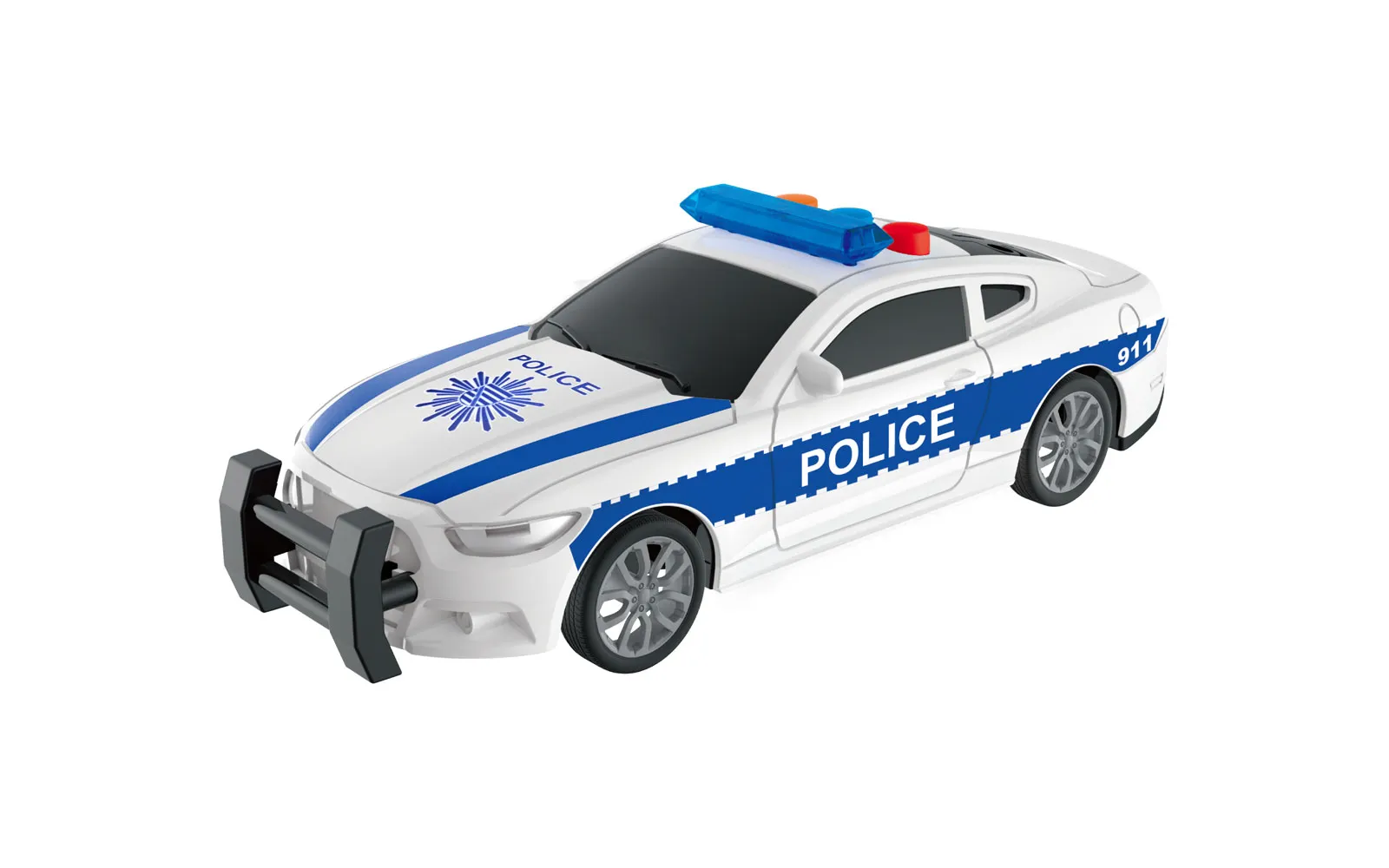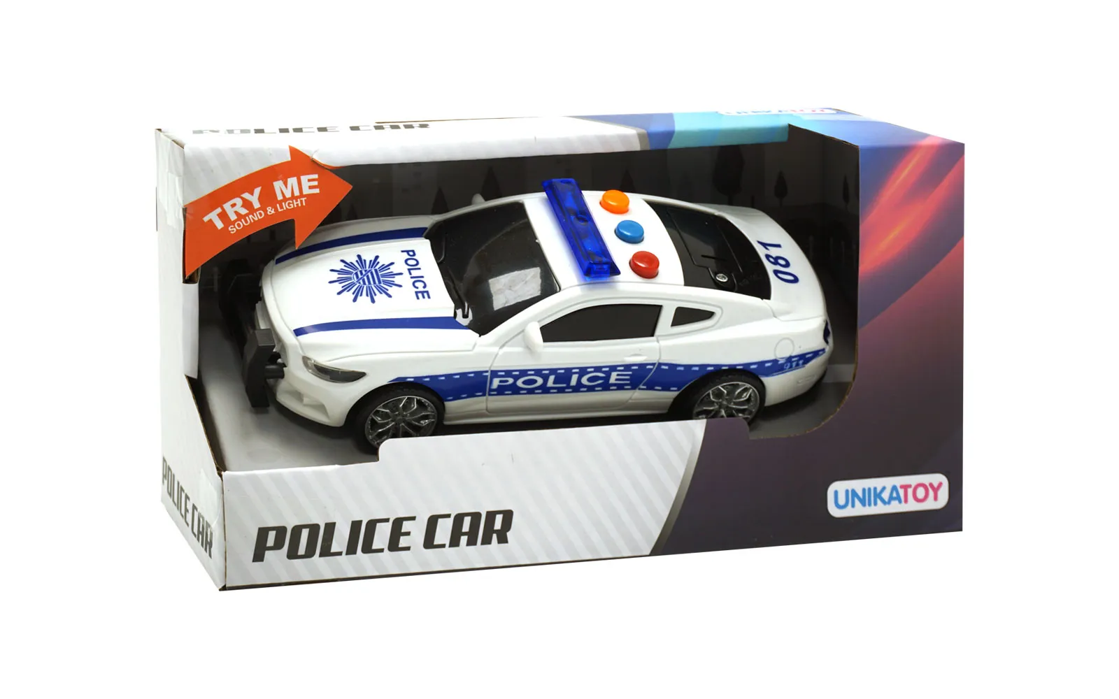 Policijski auto veličine 17 cm sa zvučnim i svjetlosnim efektima. Na krovu vozila nalaze se 3 tipke koje proizvode 3 različita zvučna efekta. Dostupan u dva stila.
