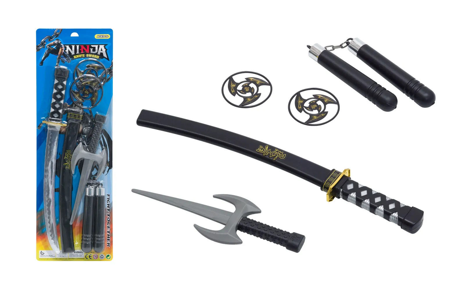 Igraći set raznih i brojnih dodataka za prave ninje. Priložena sablja ima duljinu od cca 40 cm.