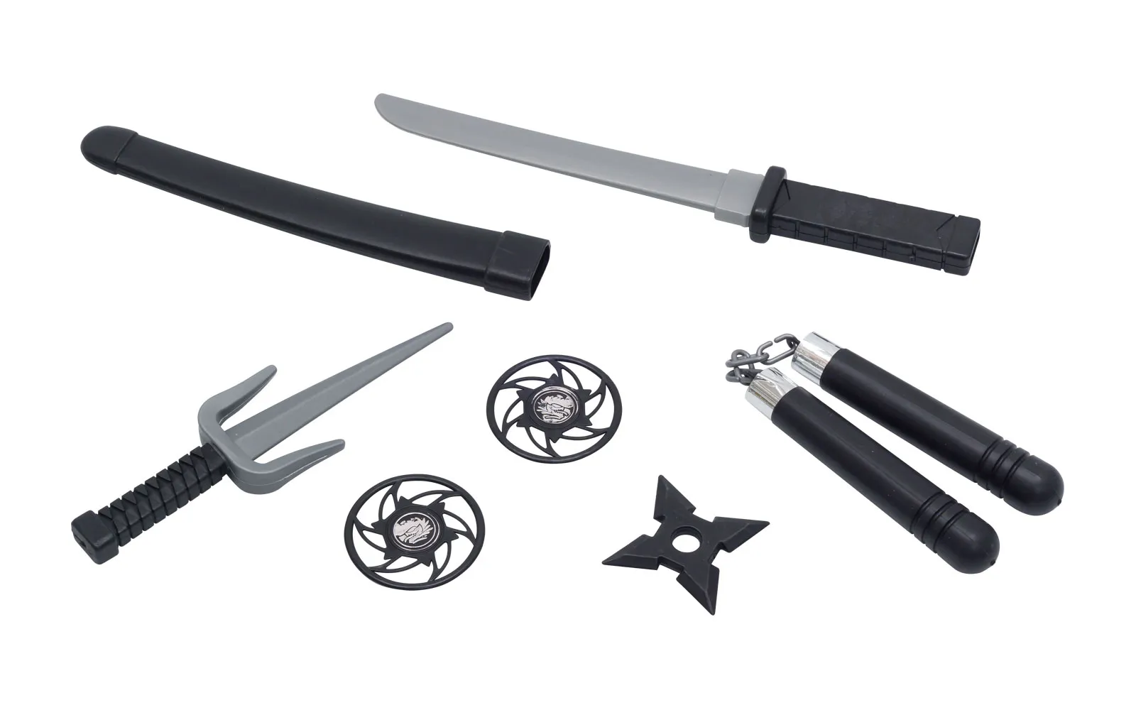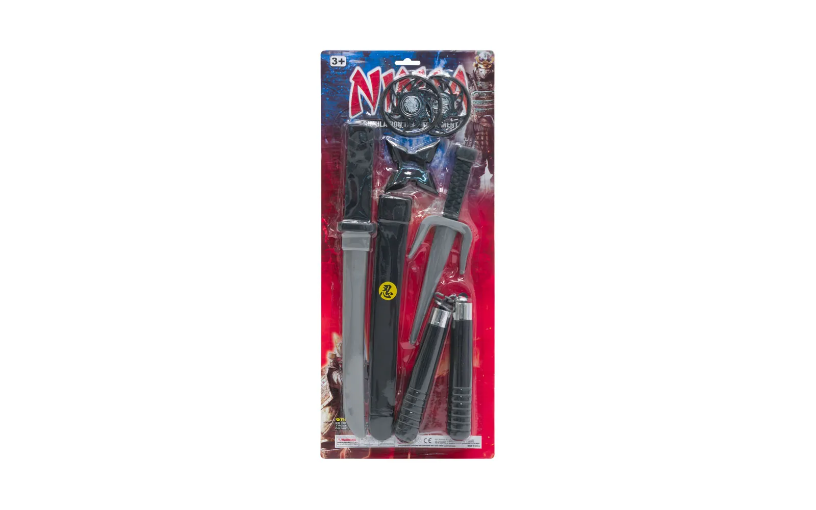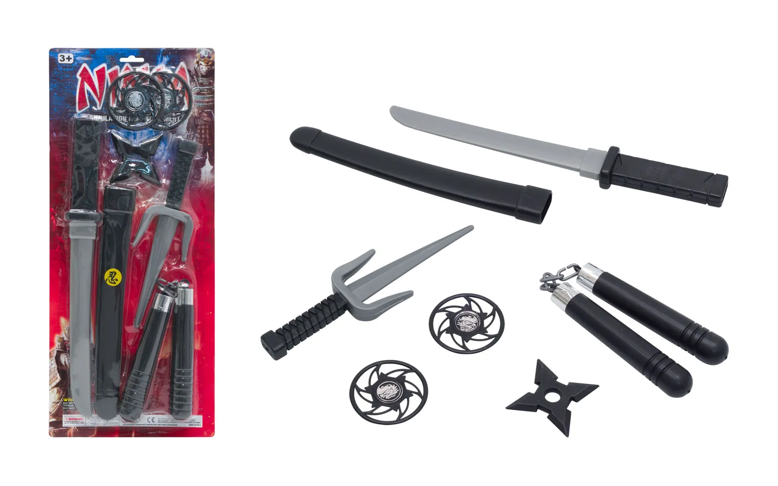 Igraći set raznih i brojnih dodataka za prave ninje. Priložena sablja ima duljinu od cca 40 cm.