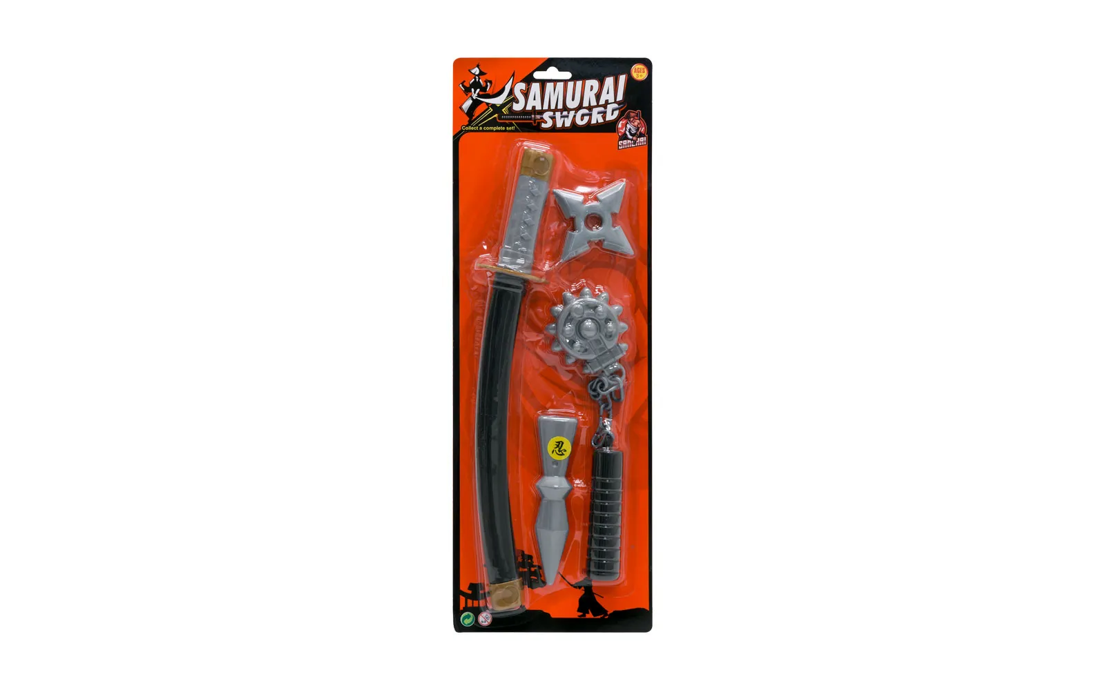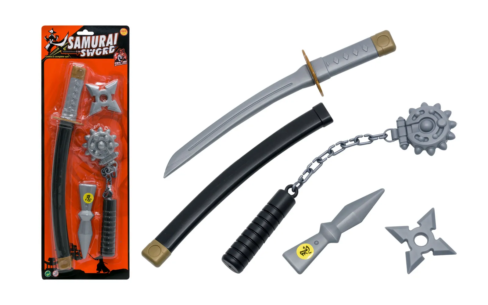 Gaming samurai set raznih i brojnih dodataka. Priložena sablja ima duljinu od cca 40 cm.
