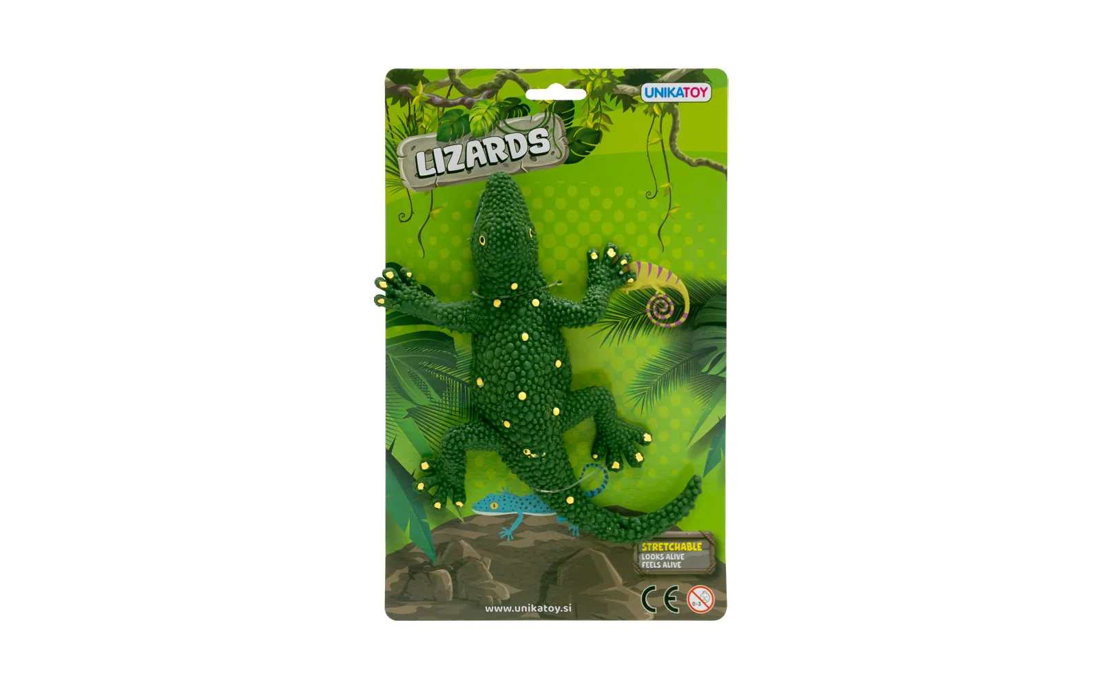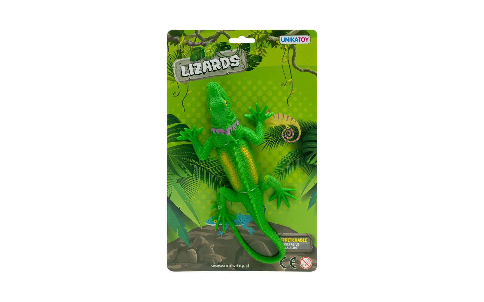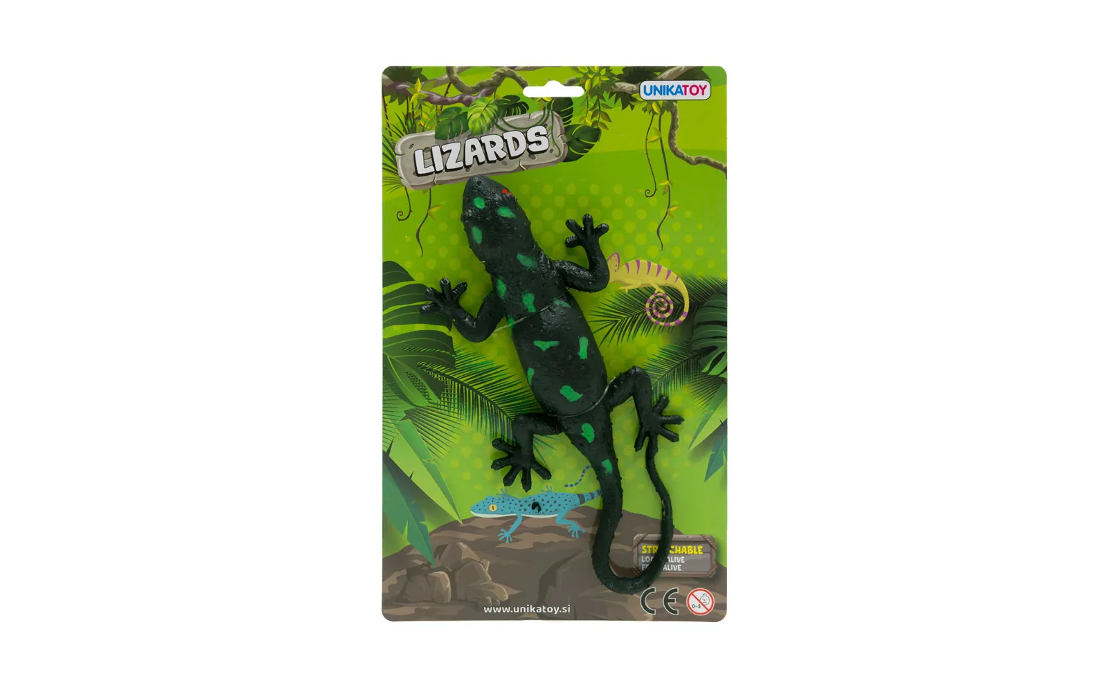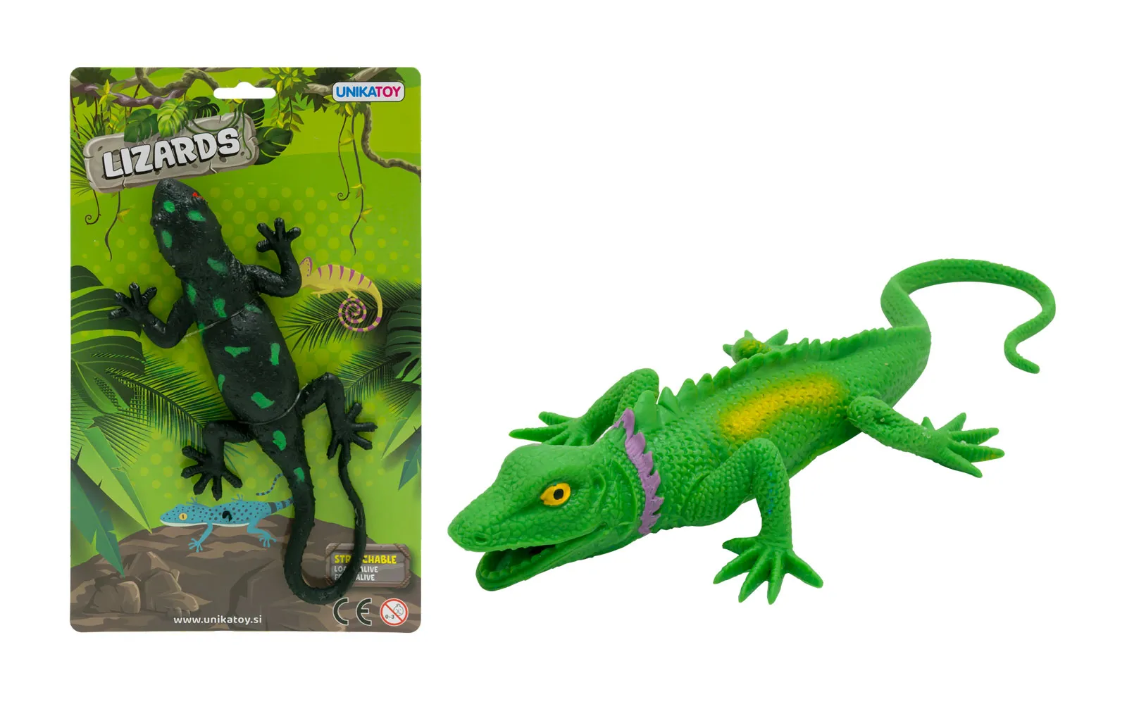 Izgleda kao pravi i rastezljiv je ovaj mali gušter dvije različite boje. Za djecu od 3. godine starosti nadalje. Duljina jednog guštera s rastegnutim repom je 30 cm.