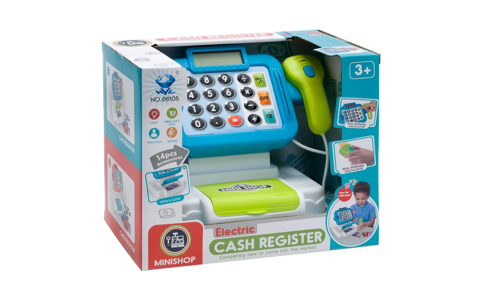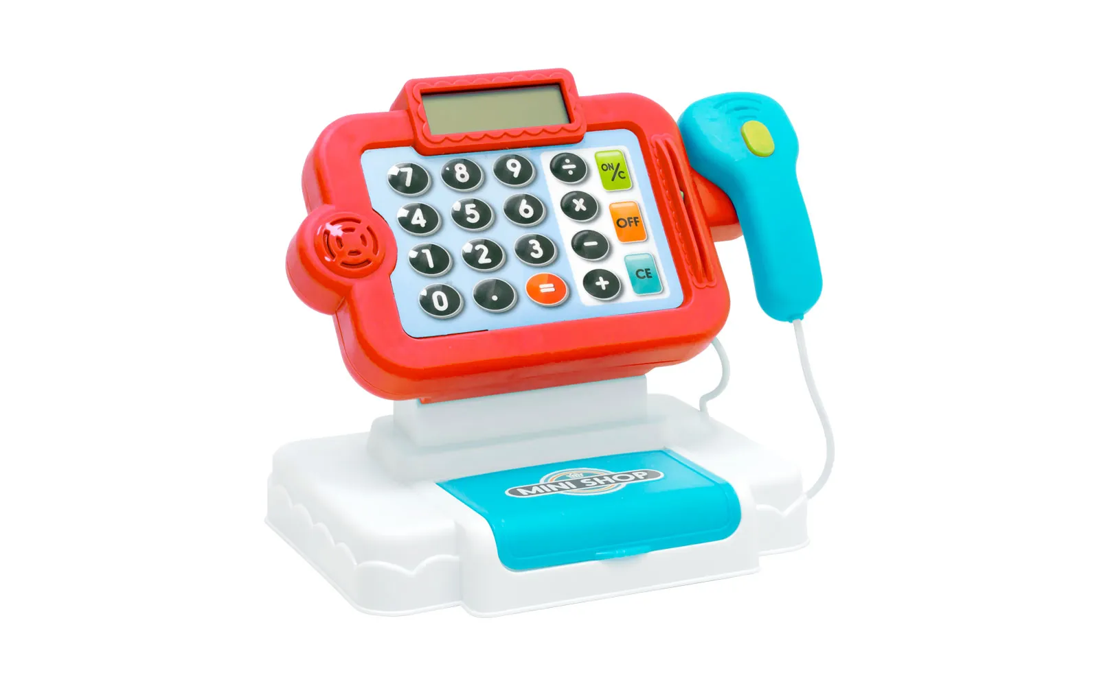 Blagajna na baterije ima funkcionalni kalkulator, svjetlo i skener. Osim toga, ima razne dodatke - novčanice i plastične kovanice. Za rad je potrebno dvije baterije tipa AA, koje nisu priložene.