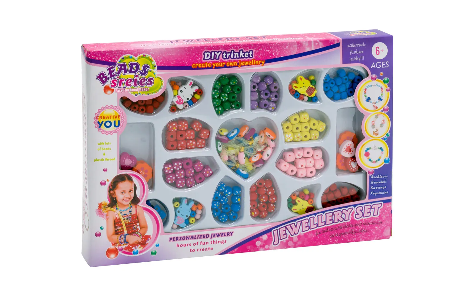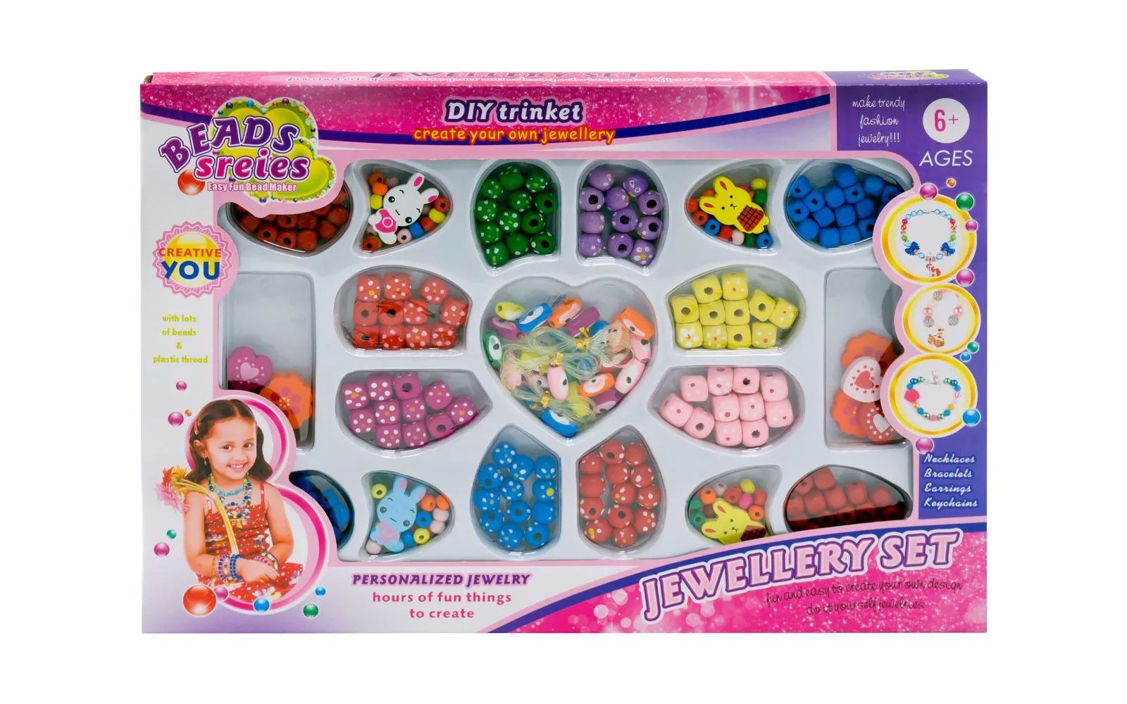 Set drvenih dodataka za ogrlice. U setu se nalaze konci, na koje se mogu staviti priloženi dodaci i odmah nastaju pravi modni dodaci. Set uključuje dodatke različitih oblika, boja i uzoraka, sve što mala modna zaljubljenica treba da zasja. Igračka je pogodna za djecu od 6. godine starosti nadalje.