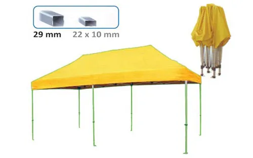 Događaj na otvorenom, sunce ili prognoza kiše. Ne uznemirujte se, nego nabavite žuti šator veličine 3x6 m sa aluminijskom konstrukcijom te vatrootpornom i vodootpornom navlakom napravljenom od 230 g poliestera s PU i srebrnim UV premazom. Set uključuje i torbu za prijevoz, užad i klinove. Okvir je veličine 29 mm. Šator možete nadopuniti raznim stranicama: stranica sa običnim ili staklenim prozorom, puna stranica ili stranica s vratima.