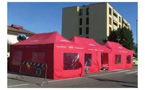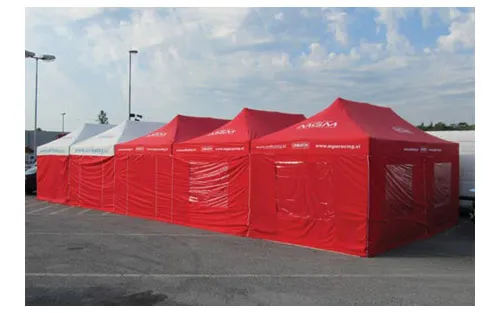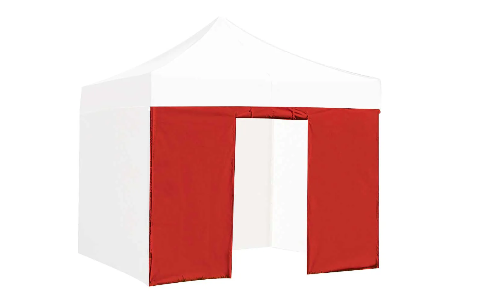 Crvena stranica šatora veličine 3 m s vratima izrađena od 230 g poliestera s PU i srebrnim UV premazom, je vatrootporna i vodootporna. Vrata stranice šatora mogu biti otvorena ili zatvorena.