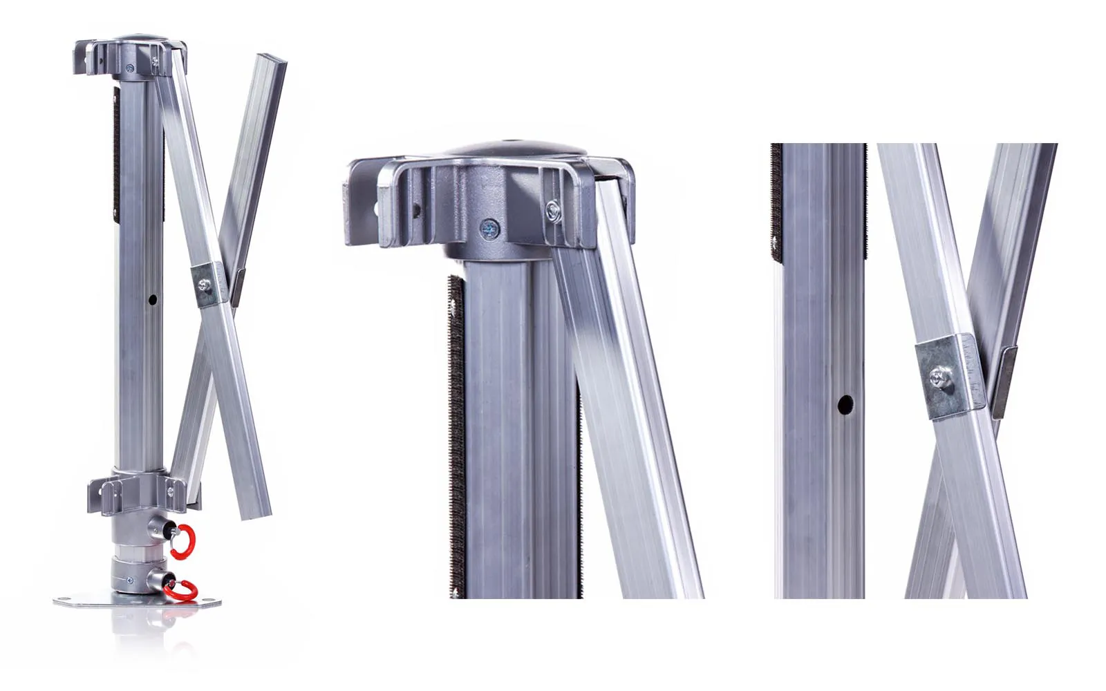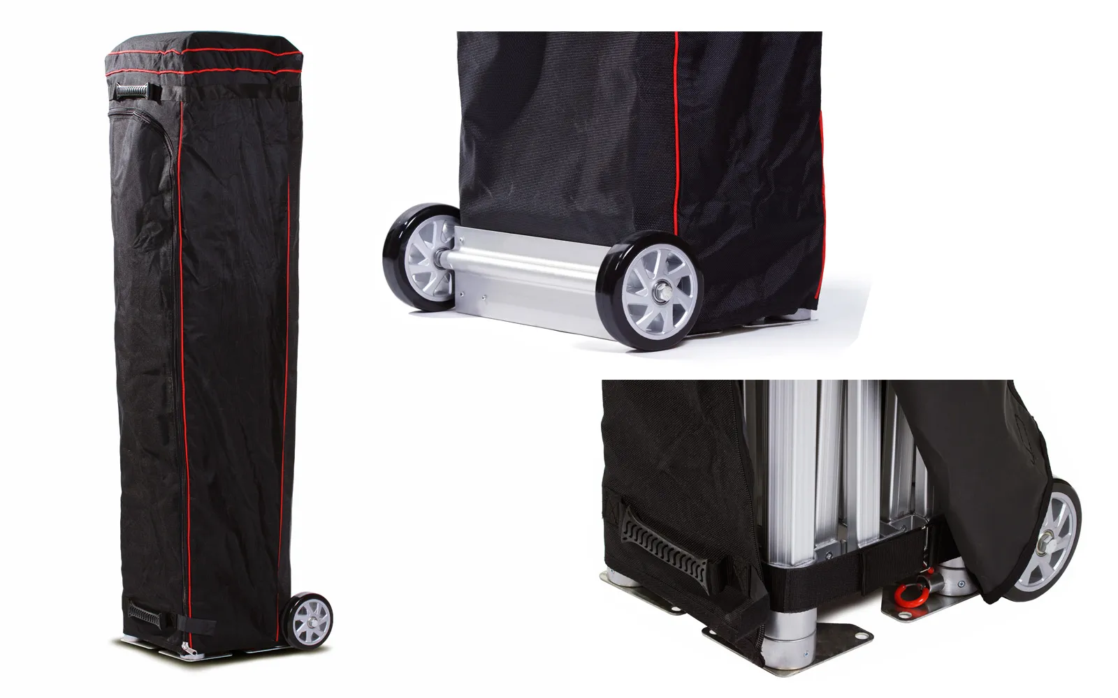 Okvir za paviljon Tendo Gazebo 3x3x3m s palicama od aluminija debljine 50x50mm brzo se sastavlja i preklapa. Zahvaljujući sustavu harmonike za metalne šipke, postavlja se i sprema za samo nekoliko minuta. Njegova lagana i kvalitetna konstrukcija vrlo je praktična za transport na različita mjesta. Okvir je izrađen od aluminija debljine 50x2mm, krovna konstrukcija je također izrađena od aluminija debljine 35x18x1.8mm. Okvir se može podesiti na 5 razina visine (maks. 2,2 m) i ima zaštitni sustav protiv oštećenja. Spojnice su izrađene od lite legure i kvalitetnog najlona (opcija), što omogućuje glatko klizanje tijekom postavljanja. Uključeni su anodizirani samozatezni vijci, vijci i matice, kao i metalni klinovi i najlonske šipke. Za jednostavan transport, uz to dobivate i praktičnu torbu na kotačima, koja se zatvara zipom i ima ručke.